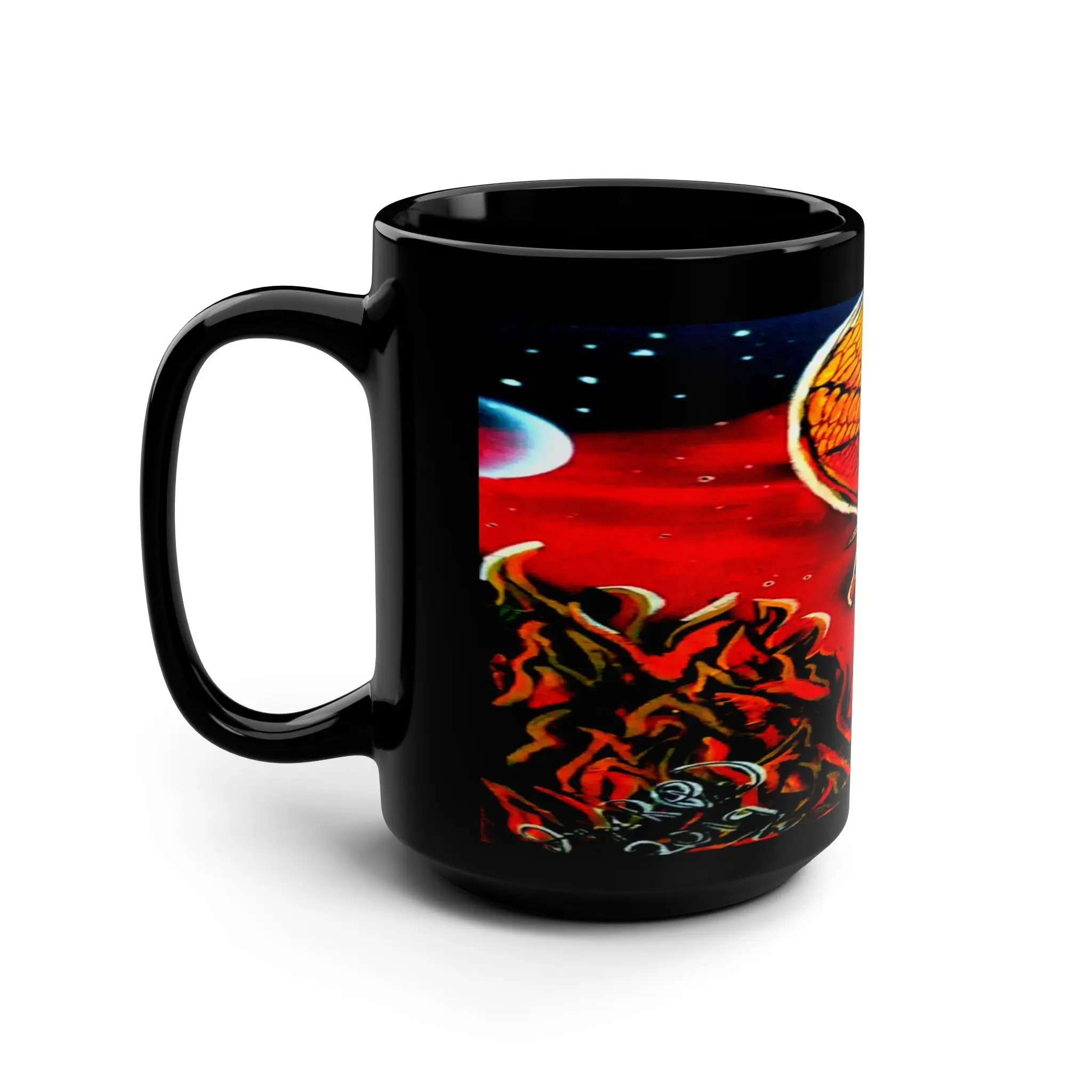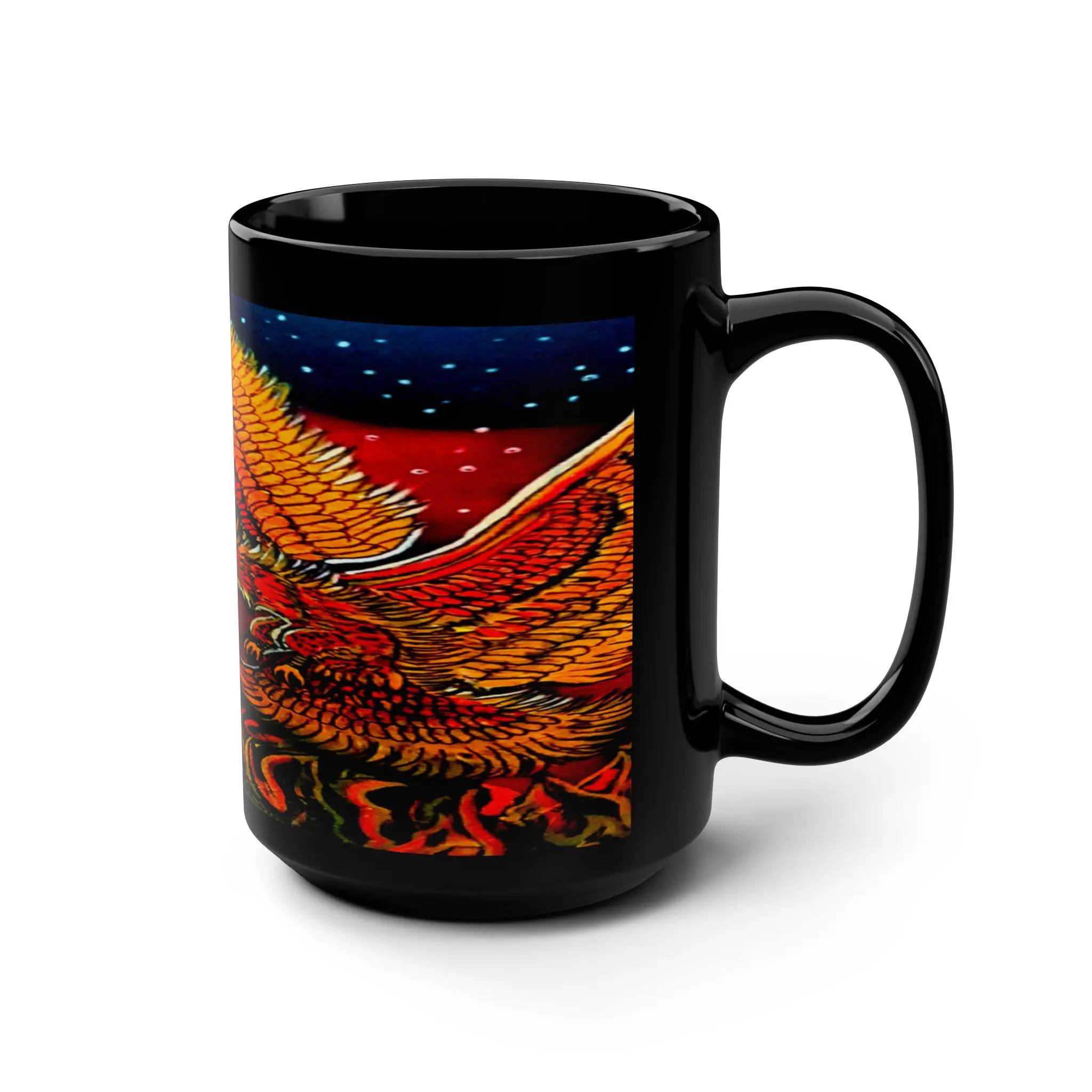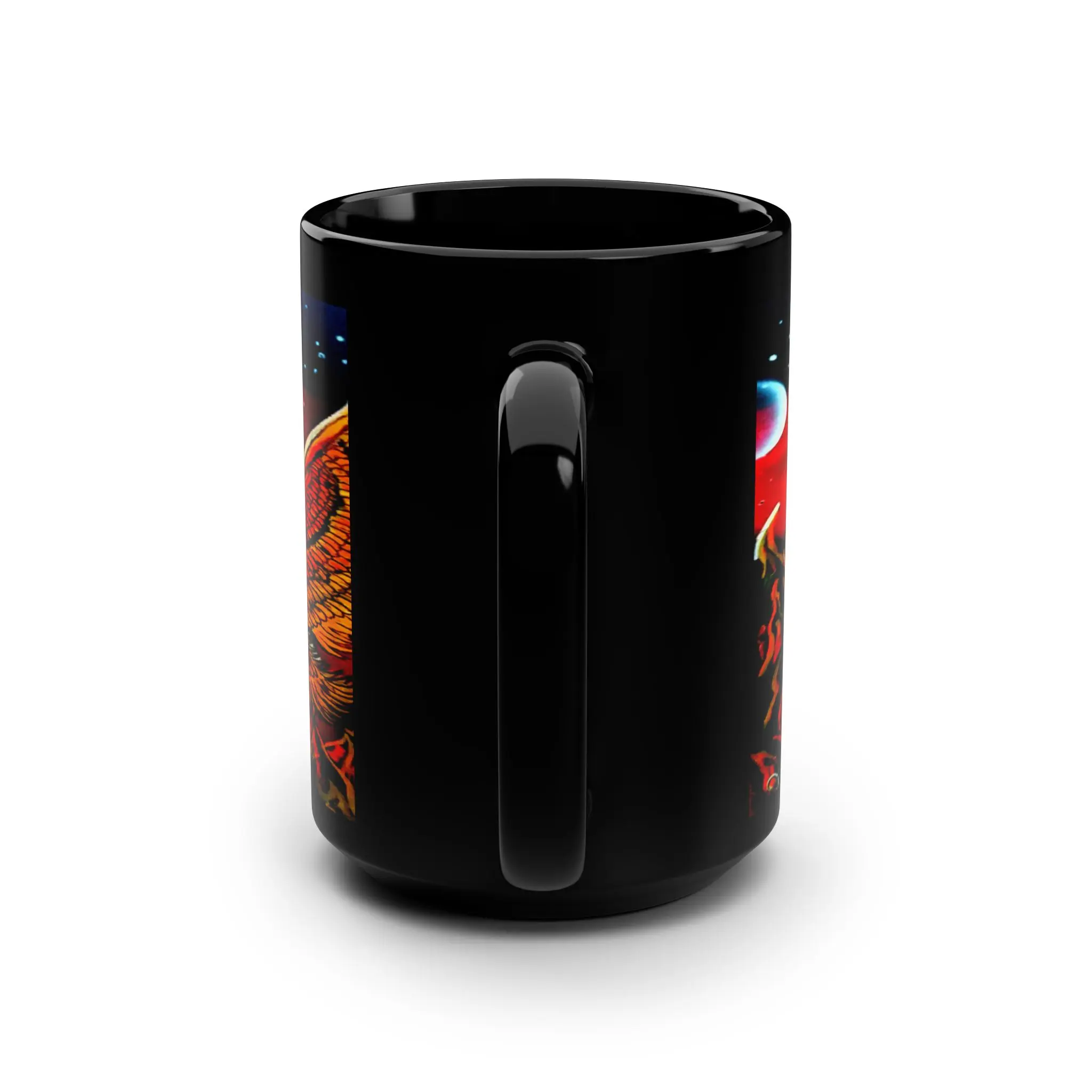 A bold, 15oz black ceramic mug that brings high-contrast, mythic energy to your morning ritual. The glossy black canvas makes the fiery illustration sing — wings of molten gold, tongue-of-flame accents, and a star-speckled night sky combine to feel both elemental and otherworldly. It’s substantial in the hand with a C-shaped grip and holds more of your favorite brew so the scene can be enjoyed through a long read, late-night sketch session, or heady conversation. Durable, dishwasher- and microwave-safe, and free of lead and BPA, this mug is built for everyday use while keeping the artwork vibrant over time.