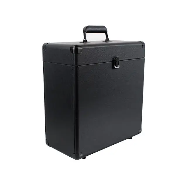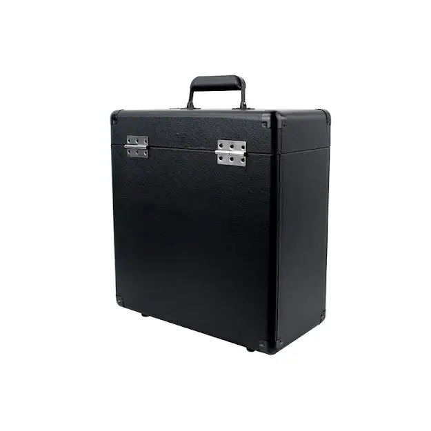 Manufactured from wood and covered with a simulated black leather vinyl material, this case provides easy transport along with extra strength and protection of your 12" LP Vinyl Records.