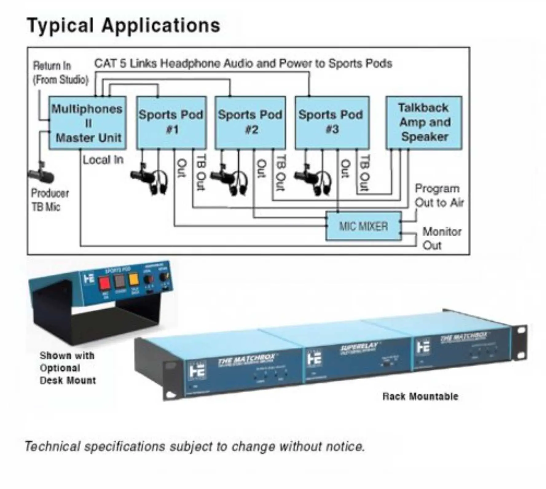 Sports Pods can be powered with an external wall transformer; one transformer will power several units linked with cat5 cables. If used with a MultiPhones Master unit or SixMix USB Console, the transformer is not required. Talent Pod is 1/3 rack width, and can be rack mounted using the optional Rack Shelf. It can also be mounted using the Desk Mount or the wall/cabinet mounting brackets.