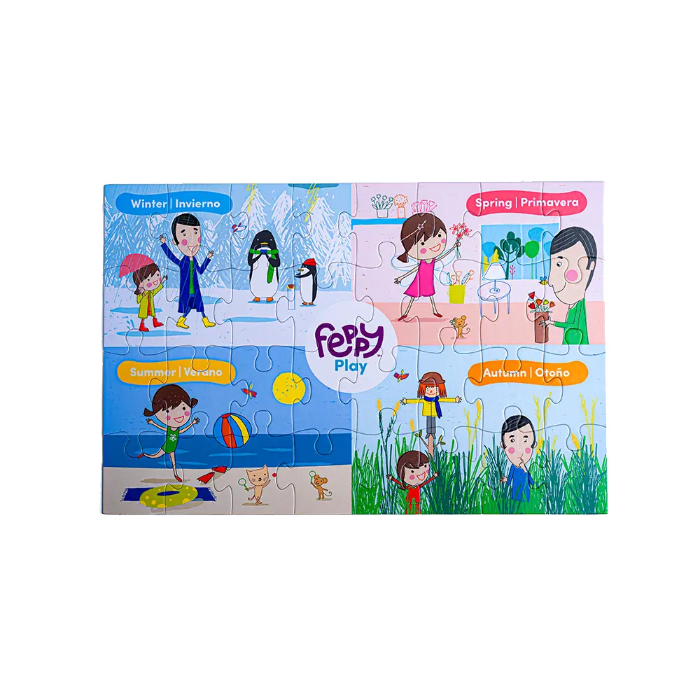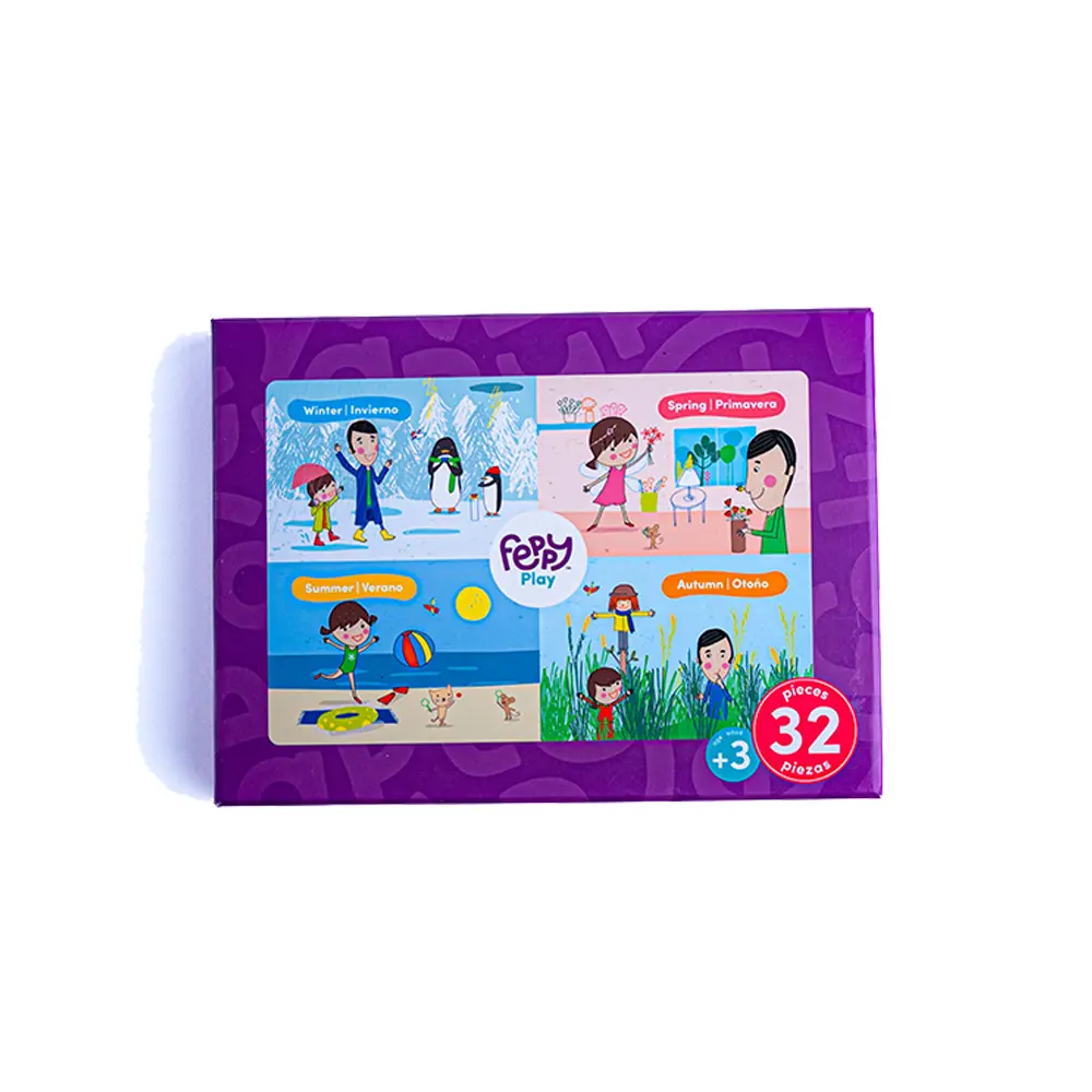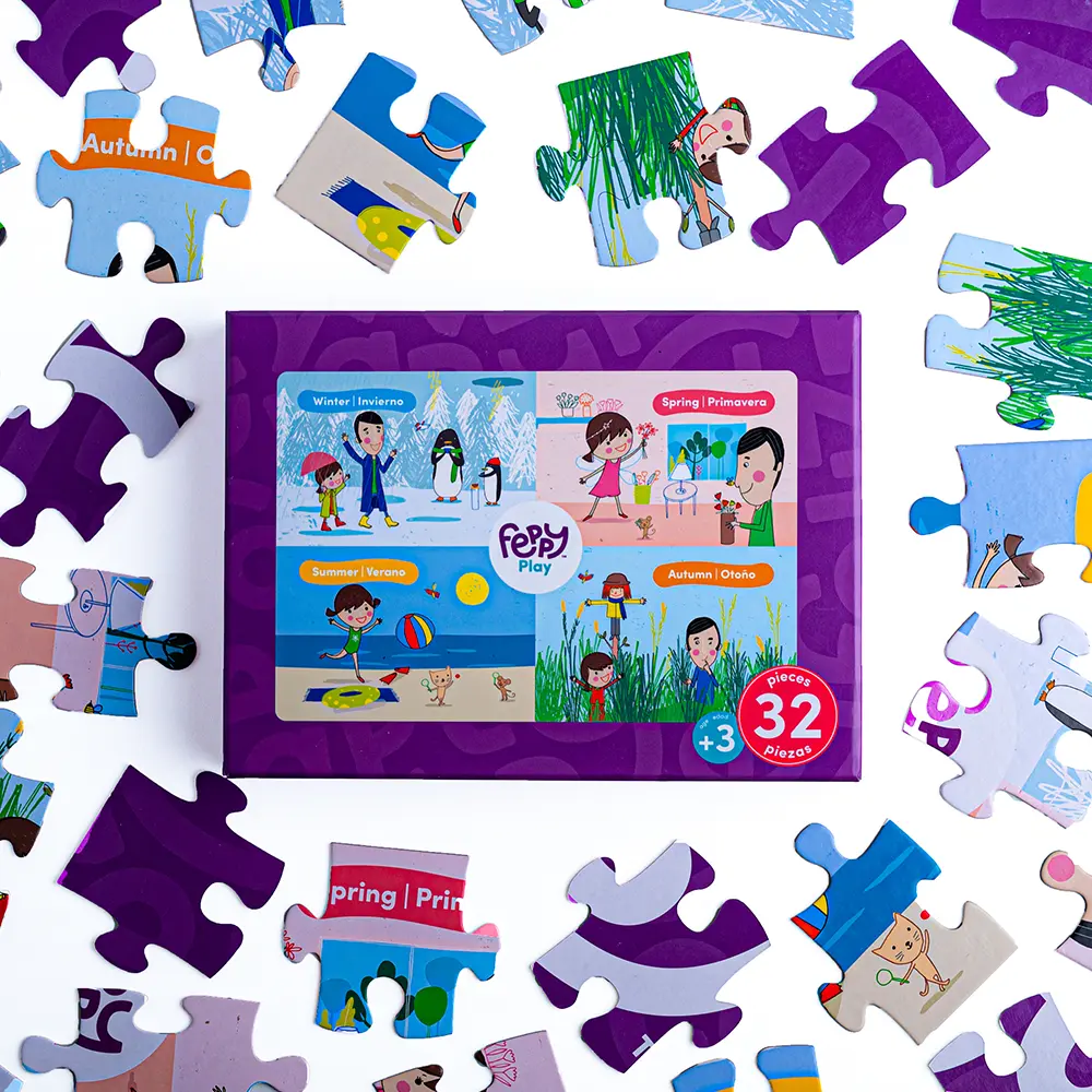 Learn Spanish through play! Learn all about the seasons with the new Feppy Bilingual Puzzle: The Season- Las Estaciones. This bilingual game allows kids to learn about seasons one piece at a time in Spanish and English. For kids ages 3 yo and up.