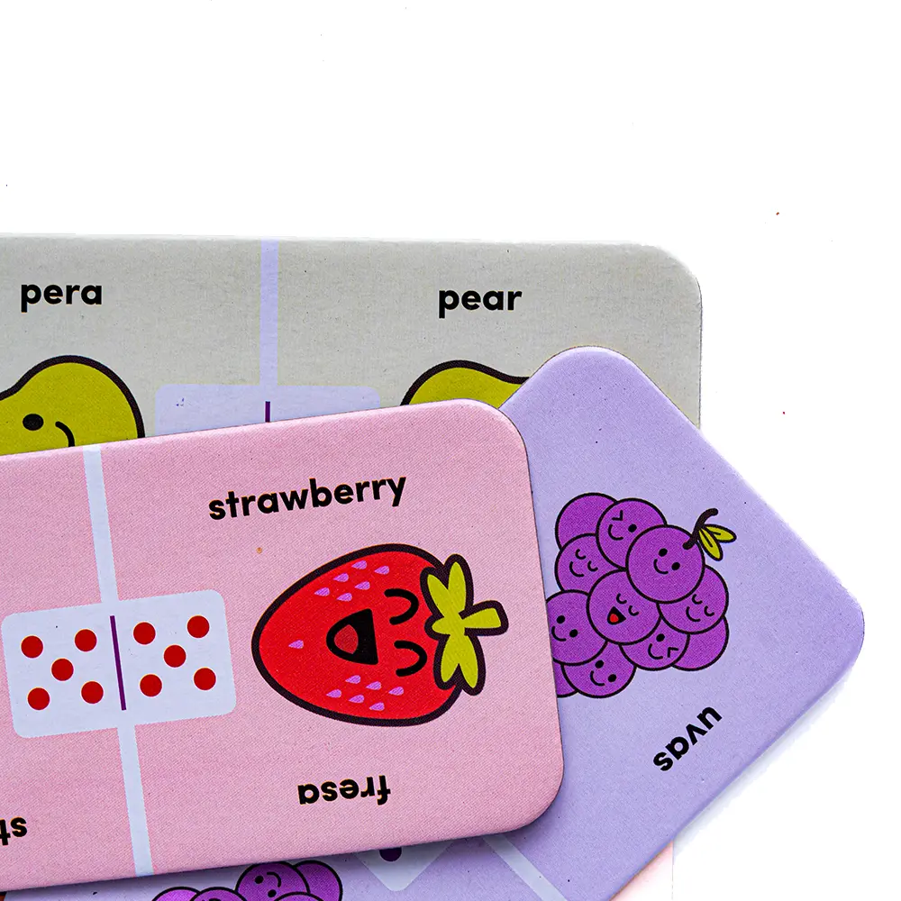 ·Bilingual Toys for Spanish Learners - The classic card game—with a bilingual twist! Triple the fun: match the image, number, and word. Practice the name of the delicious fruits: Pineapple, Grapes, Peach, Orange, Pear, Strawberry, and Banana in Spanish and English!