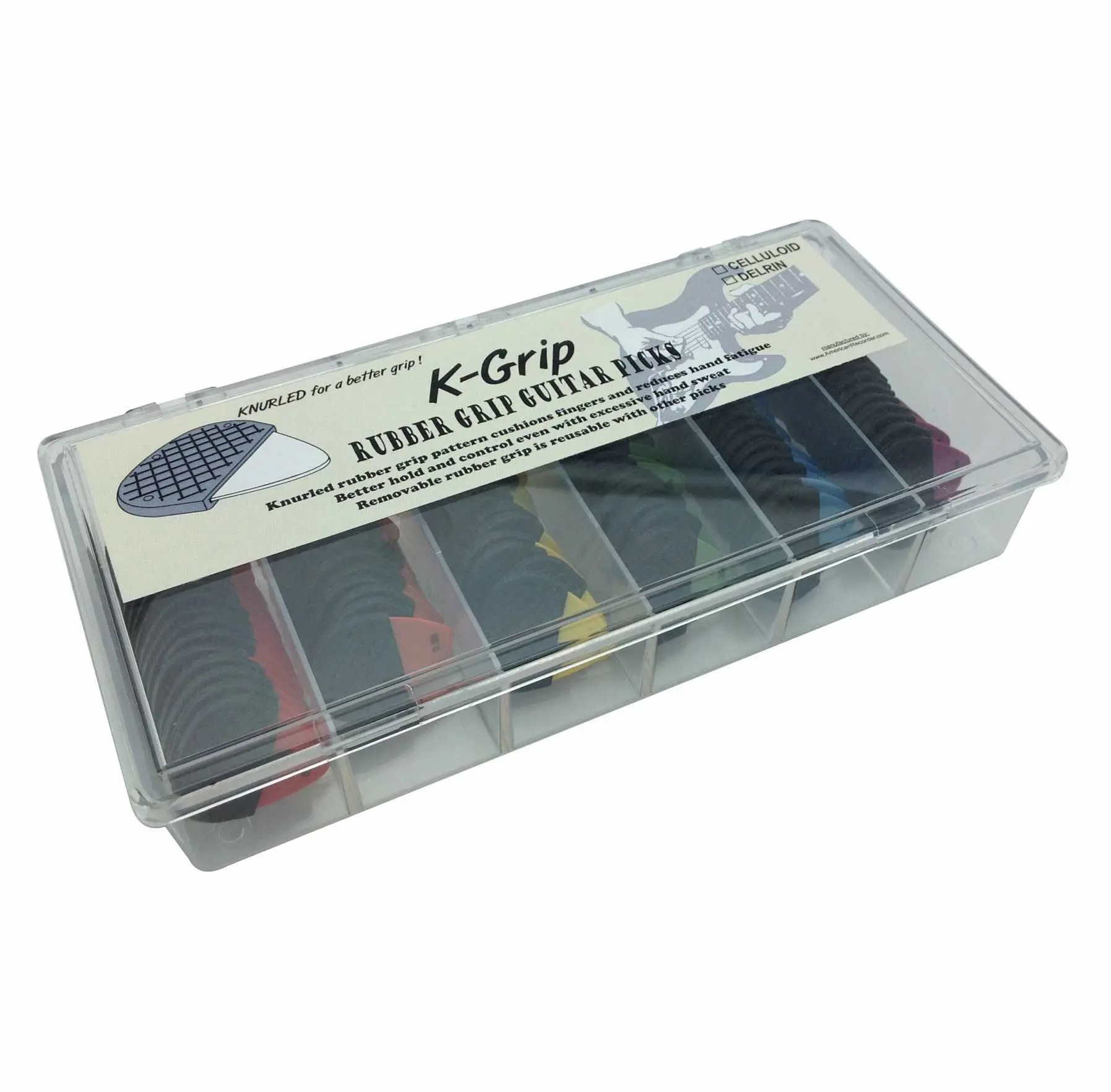 These Celluloid Guitar Picks have our Dynamic Knurled Rubber Grip that provides an amazing amount of extra control and comfort over extended playing sessions and will reduce pick slippage due to excessive hand sweat. And it you should break a pick, the rubber grip is removable and can then be used with another pick.