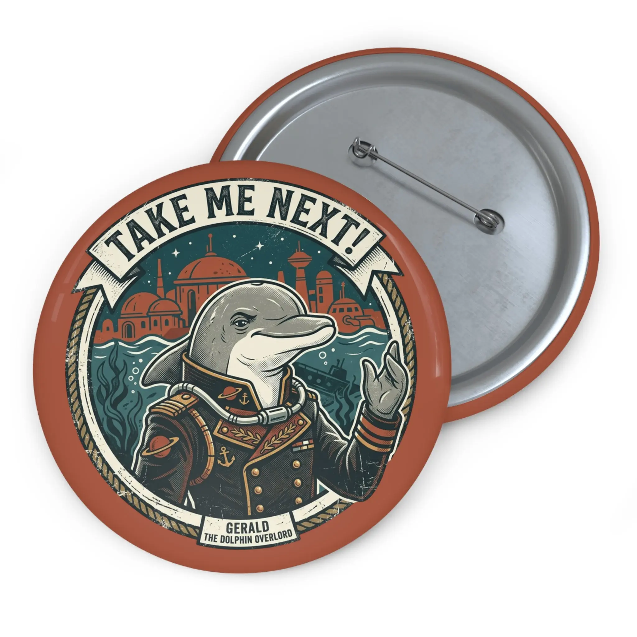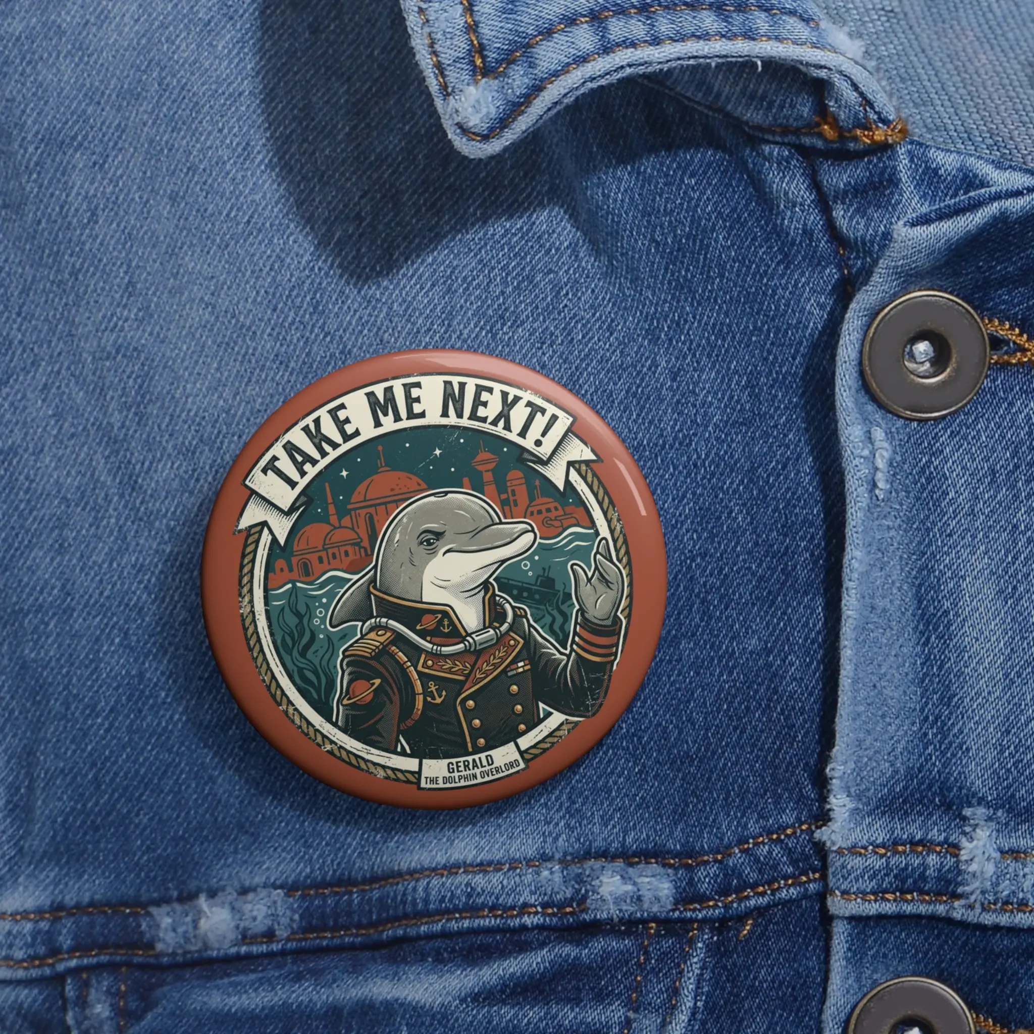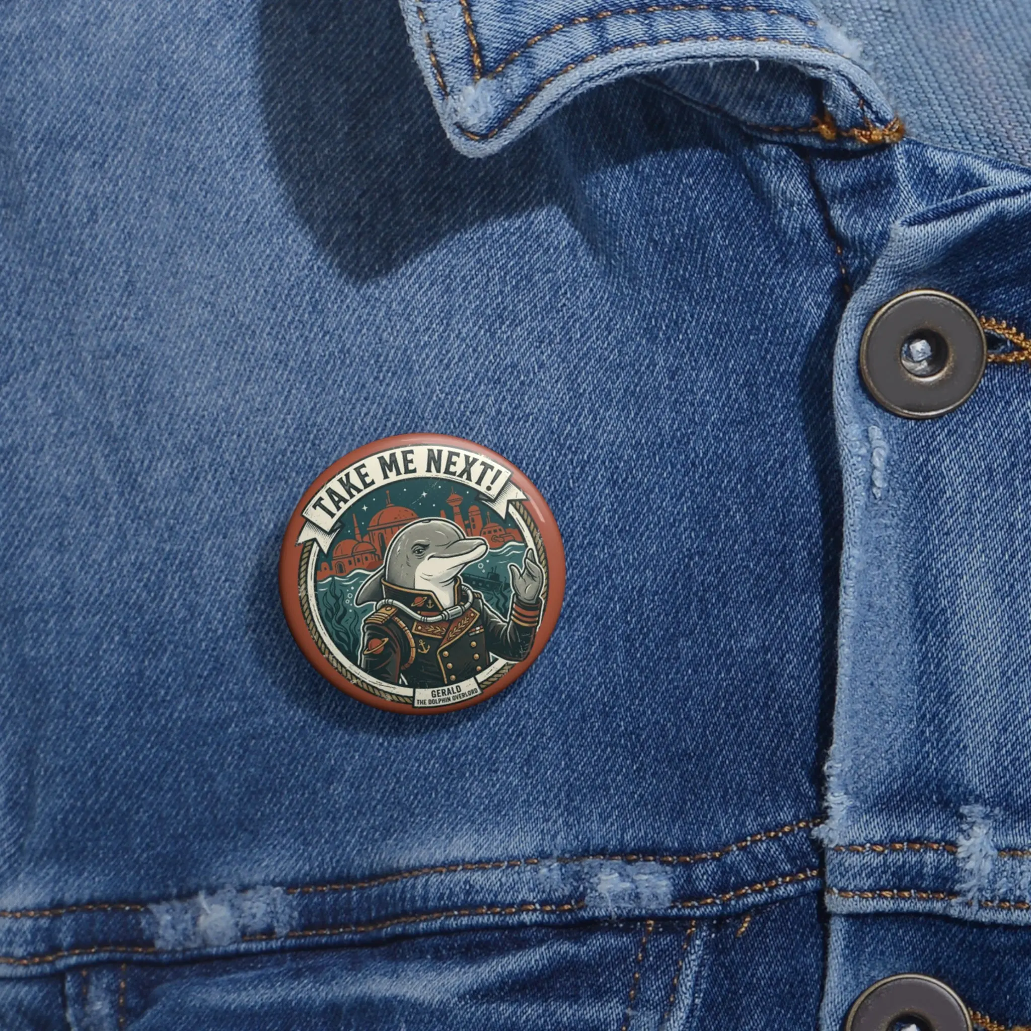 A small, character-filled pin that brings playful rebellion to jackets, bags, and hats. The illustrated dolphin in period clothing points confidently beneath the rallying banner “TAKE ME NEXT!!”, blending vintage poster vibes with bold, modern color. The glossy mylar face makes the artwork pop while protecting it from scratches and sun, and the classic safety-pin back keeps the button secure on denim and canvas. Wear it to add a witty, story-rich accent to your everyday look or to signal shared humor at concerts, meetups, and shows.