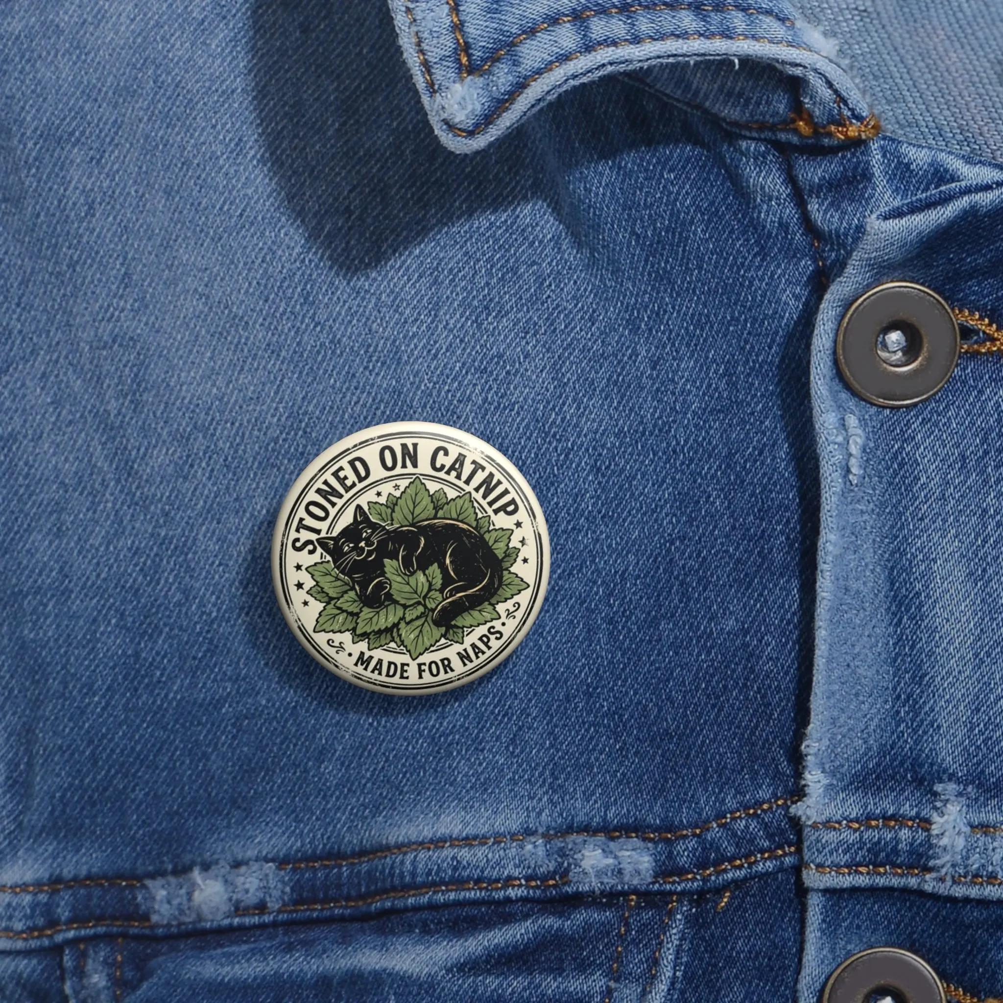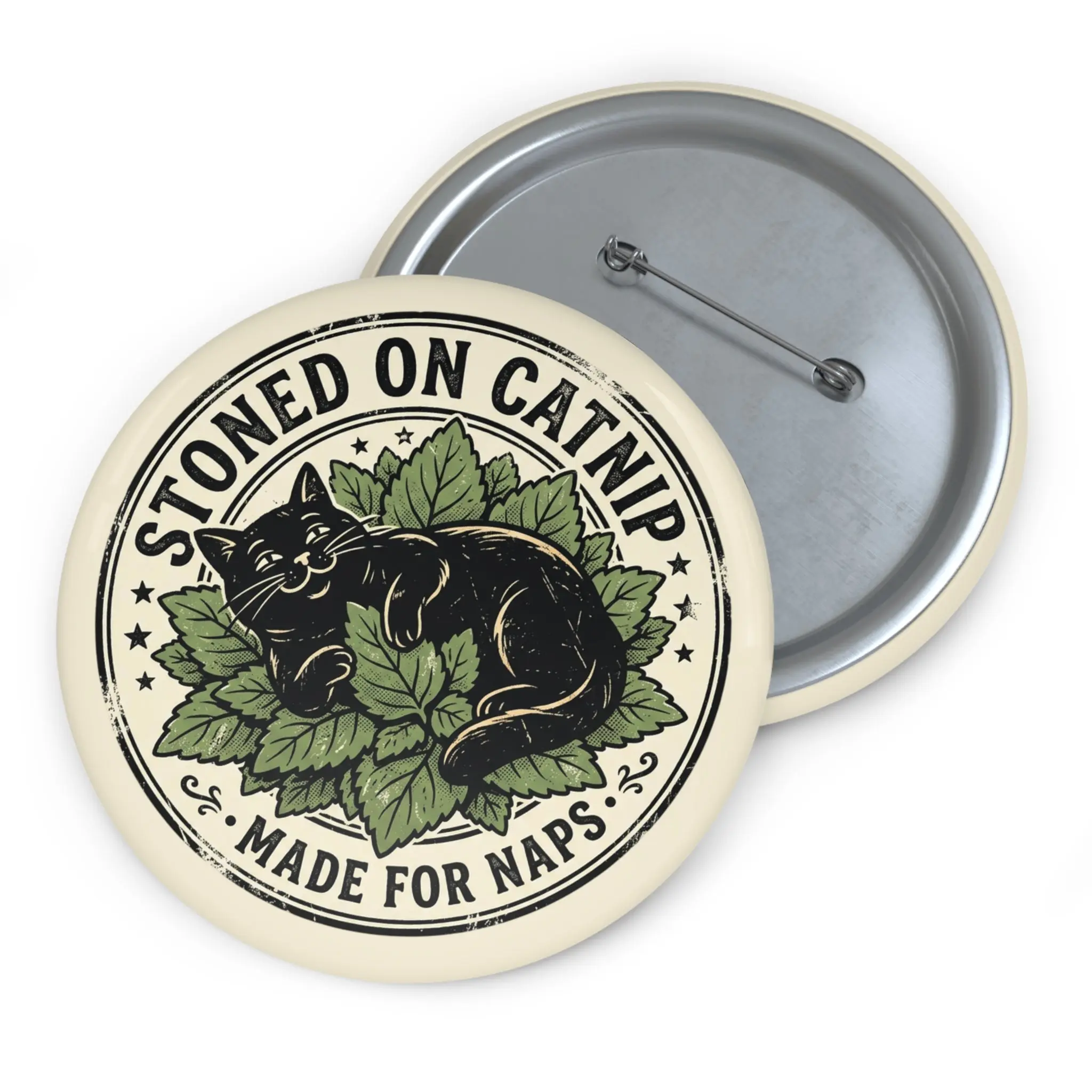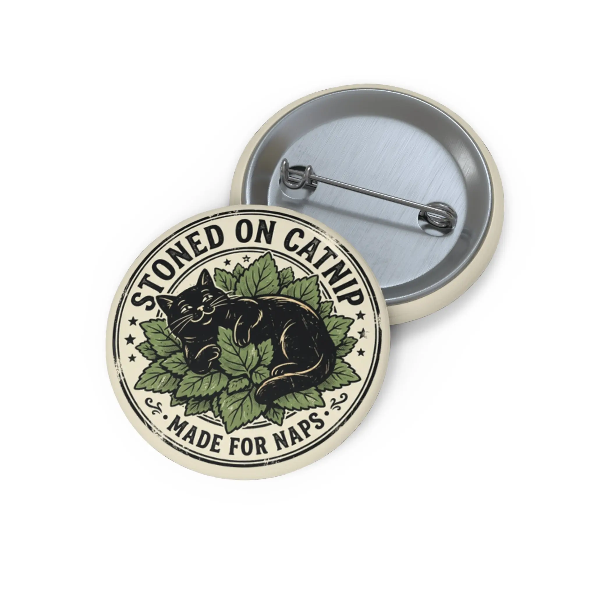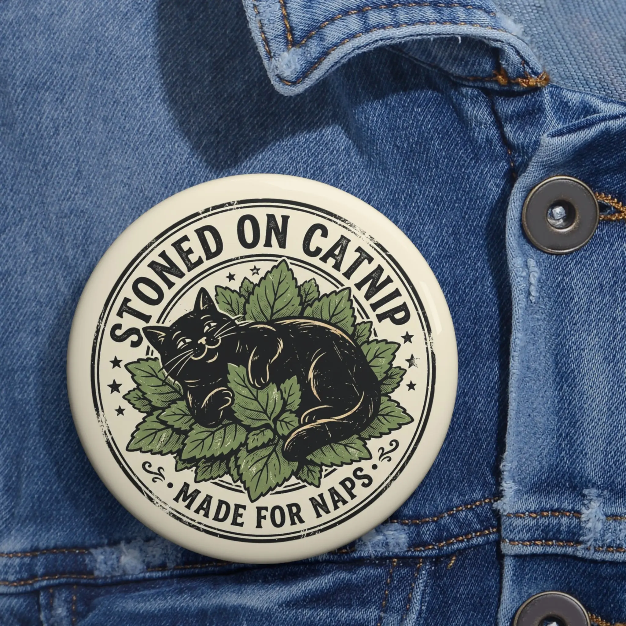 Stoned on Catnip Round Pin Button – Cute Black Cat Nap Badge