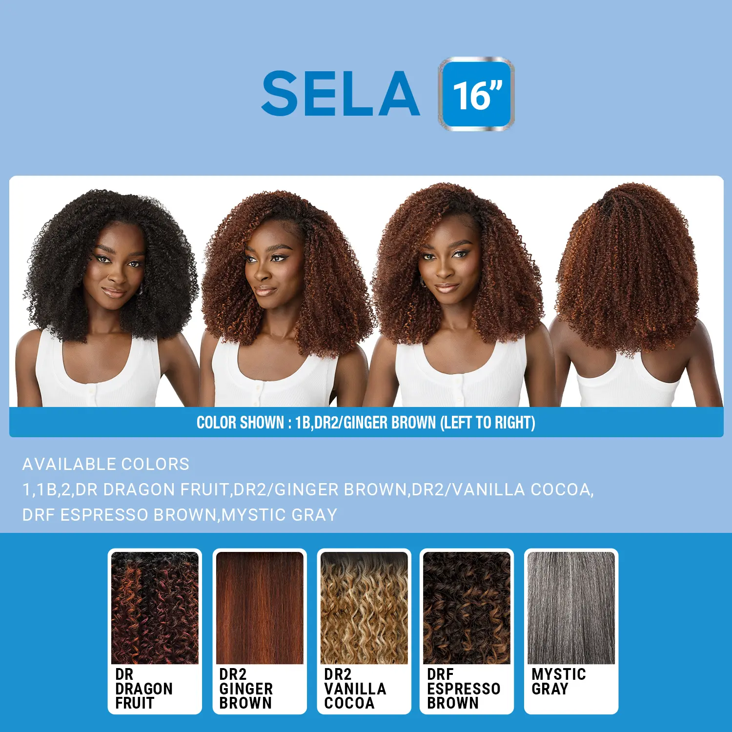 ·SELA showcases zizi coily curls with a soft fullness and natural layering throughout the 16” length. The result is a head-turning style with standout texture and striking appeal.