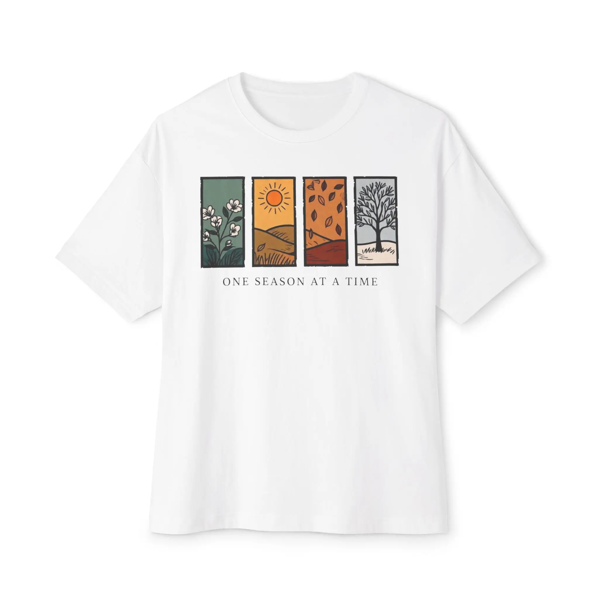 Soft, roomy, and quietly artistic — this boxy tee carries a calm celebration of the year’s rhythms. Four simple panels show blooming spring, golden sunlit summer, falling autumn leaves, and bare winter branches, with the phrase “one season at a time” beneath. The relaxed silhouette and dropped shoulders make it feel like something you slip on for slow mornings, long drives through changing landscapes, or evenings by a small fire. The lightweight but substantial cotton has a lived-in softness that ages well. It’s the kind of shirt you reach for when you want comfort that also speaks to a measured, seasonal life.