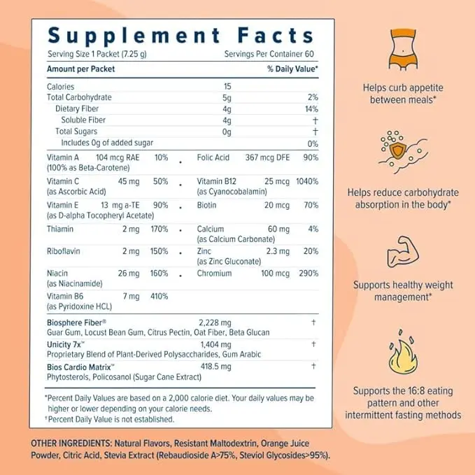 This natural orange drink mix is made with a blend of plant-based fiber ingredients, including resistant starch and oat beta glucan. Designed for everyday use, it mixes easily with water to create a smooth and refreshing orange-flavored drink.