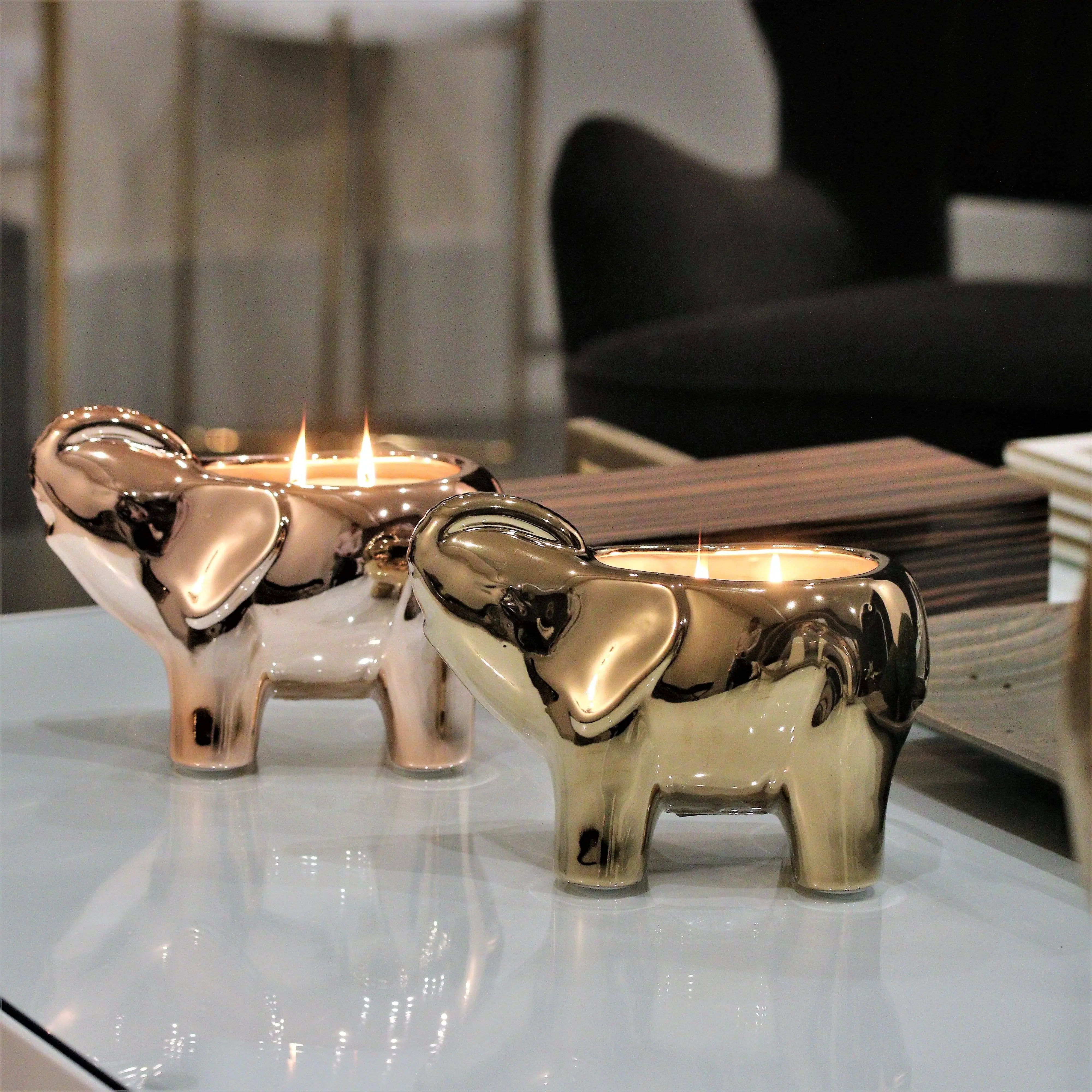 Our signature gold ceramic elephant vessel, designed in our NYC office, is a symbol of strength and good luck. Filled with a proprietary wax blend and finished with 3 wicks, this candle provides a clean and long-lasting burn. The bold gold design adds a touch of luxury to your living room or bedroom.