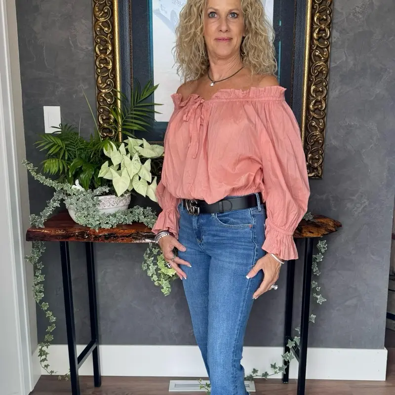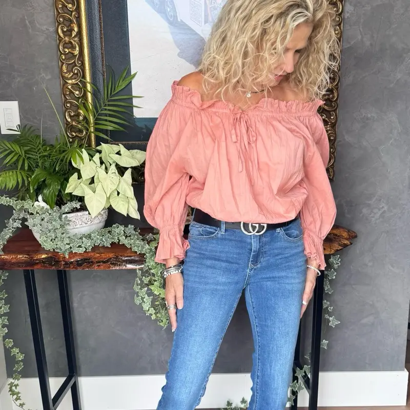 Lightweight, breathable fabric with an elastic neckline for an easy off-shoulder fit. Features a relaxed silhouette with soft feminine detail.