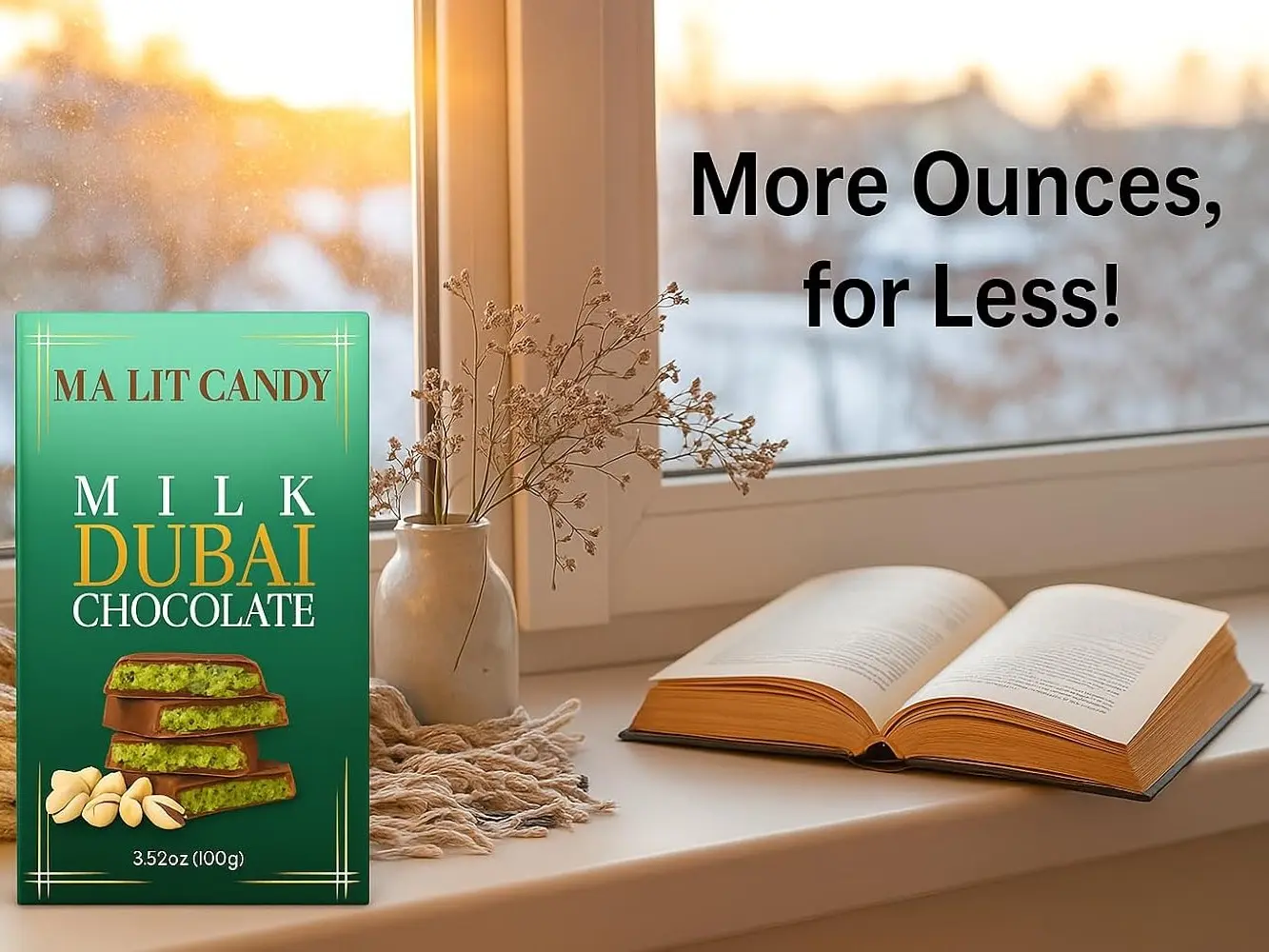 Discover the luxurious MA LIT CANDY Milk Dubai Chocolate Bar. This 3.52oz (100g) bar combines the rich taste of milk chocolate with the unique flavors of pistachio and knafeh (kataifi). Perfect for those seeking a viral Dubai chocolate experience.