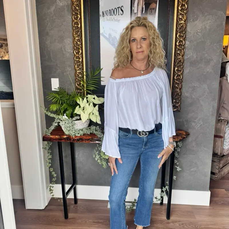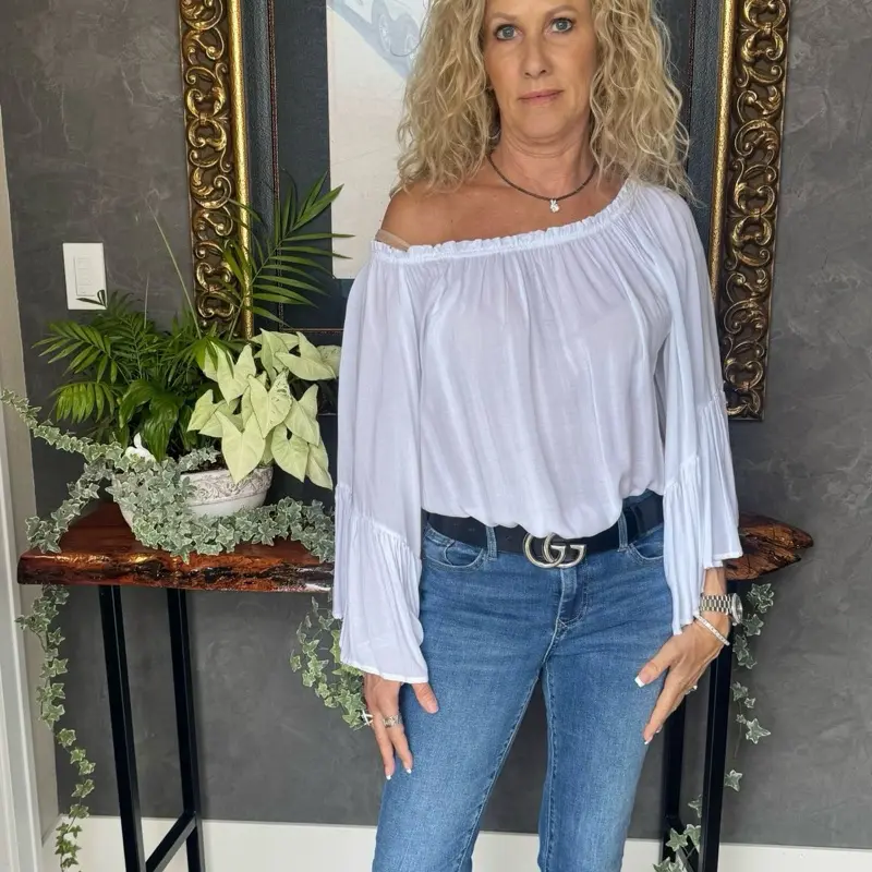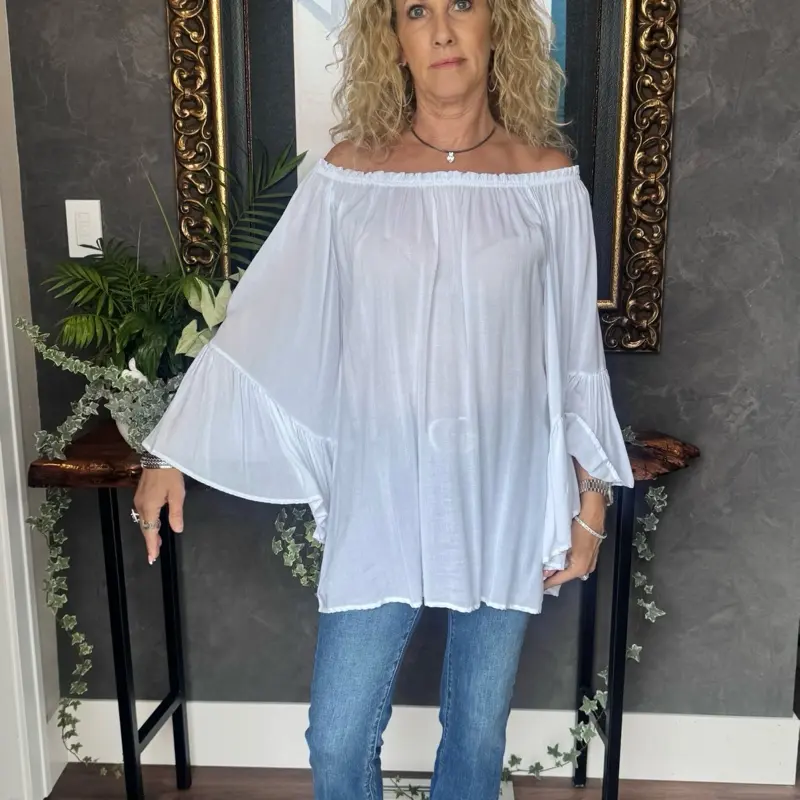 Lightweight, flowy fabric with an elastic neckline for an easy off-the-shoulder fit. Relaxed silhouette with soft drape for an effortless look.
