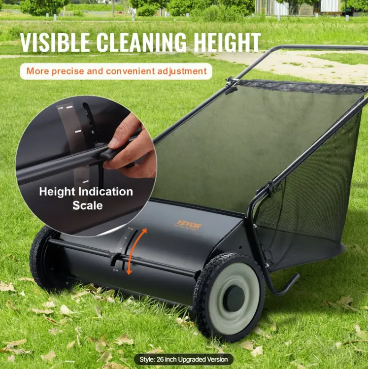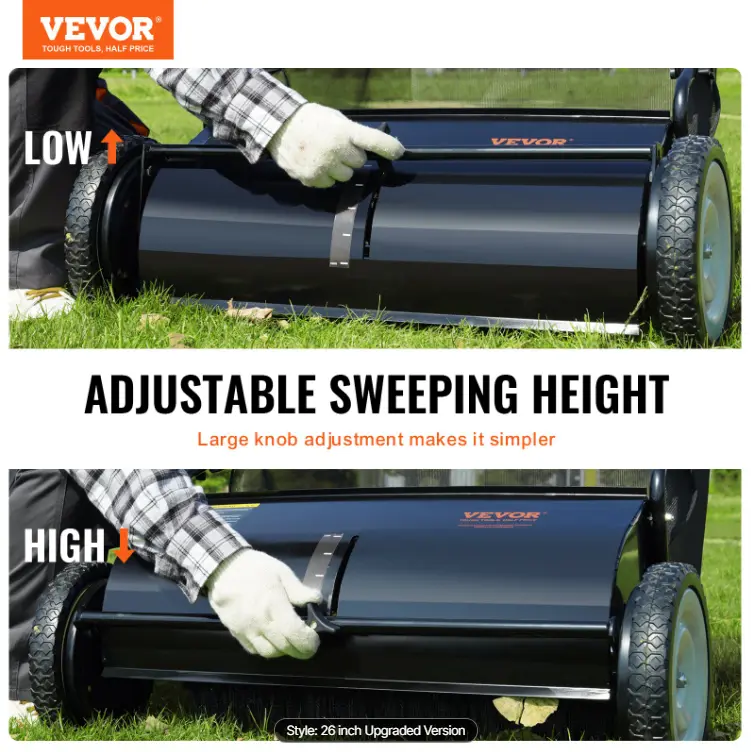 ·Heavy-Duty Construction: Our hand push lawn sweeper is built to last with reinforced steel pipes, providing a stable and sturdy frame that won't tip over even when the hopper bag is full. Plus, we've added a height scale guide next to the knob for easy adjustment before cleaning.