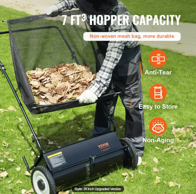 ·Collect More Debris: Our yard sweeper has a high-quality non-woven hopper bag with a large capacity of 7 ft³, allowing you to collect more grass, leaves, and debris at once without frequent dumping. It's easy to remove from the frame and quickly dump when cleaning is complete.