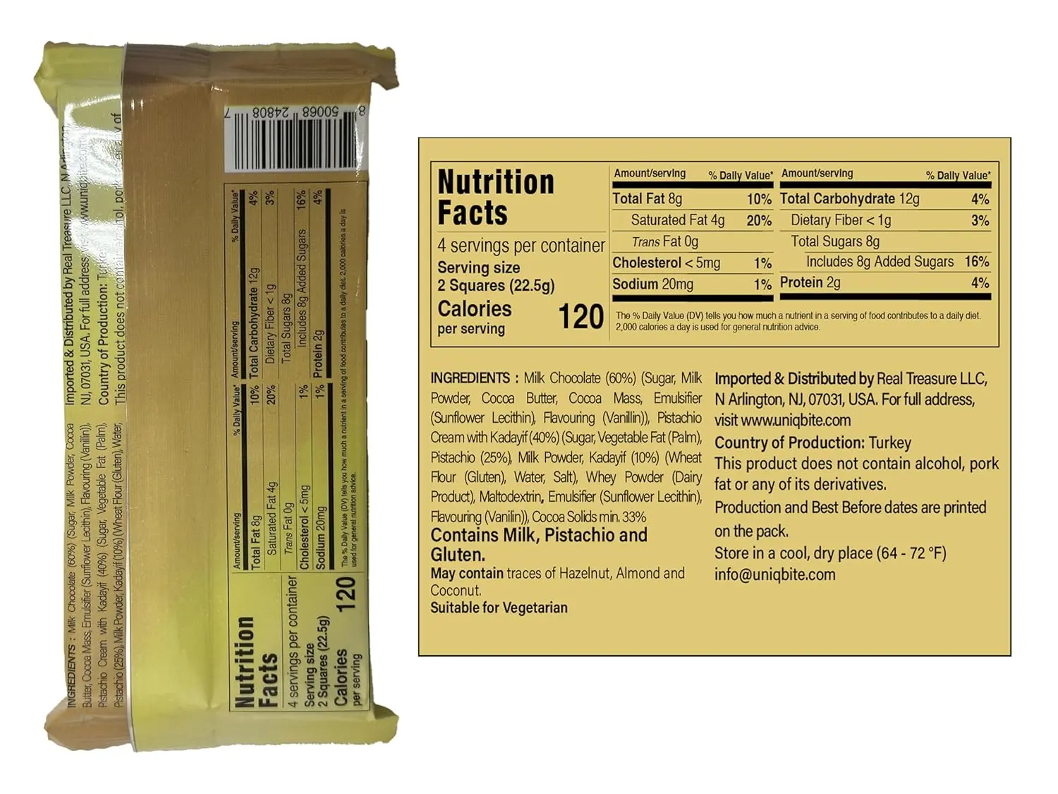 Discover the Dubai Chocolate Bar Pistachio, a 90gr treat that combines traditional flavors with modern indulgence. This bar features a rich chocolate base, topped with creamy pistachio and kataifi. Perfect for those who love a unique twist on classic desserts.