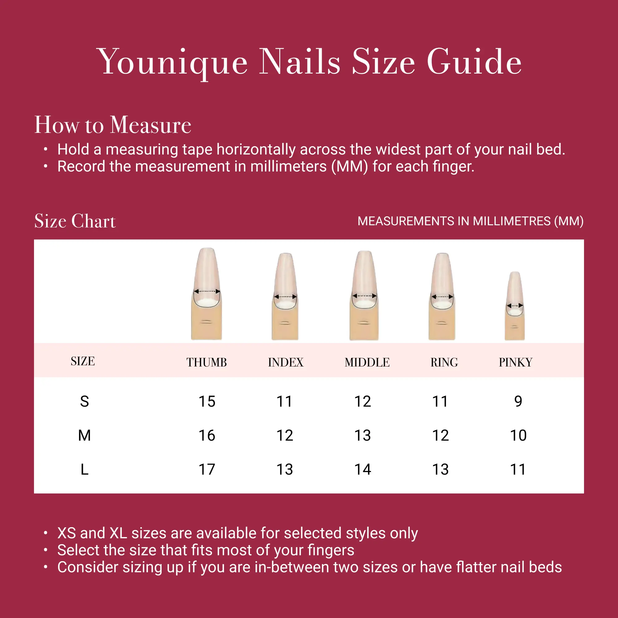 ·Size Reference (Nail Width in mm): XS (14,10,11,10,8) S (15,11,12,11,9) M (16,12,13,12,10) L (17,13,14,13,11)