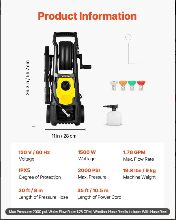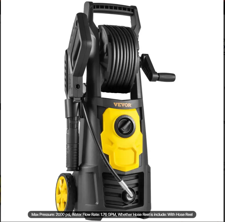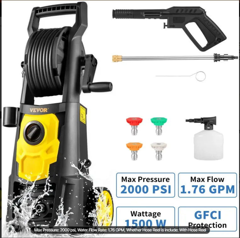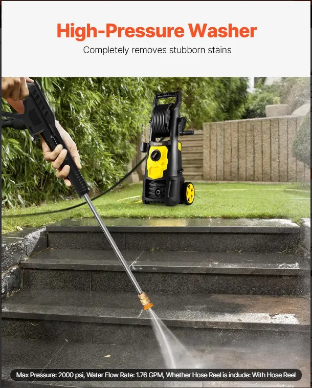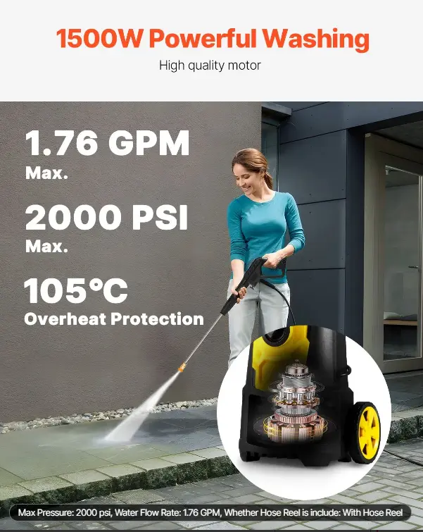 ·2000PSI High-pressure Washer: Built with a powerful 1500 W motor that generates a high water flow rate of up to 1.76 GPM. Hence, VEVOR’s electric pressure washer can completely clean up old paint, oil, weed, and other stubborn stains. Ideal for homes, RVs, patios, fences, decks, driveways, cars, lawn equipment, etc. Automatically stops working when temperatures reach over 105℃, ensuring ultimate security and consistent high quality performance. It is ETL certified.