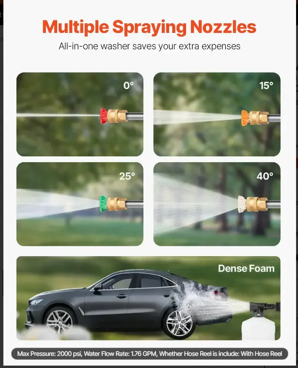 ·4 Nozzles for Different Jobs:The pressure washer provides 4 quick-connect metal spray nozzles ( 0°/ 15°/ 25°/ 40° ) and a 500 ml self-spraying detergent bottle for best suiting your different cleaning tasks. The water inlet filter makes the water nozzles spray smoothly without any blockage. Therefore, you do not need to change nozzles frequently, saving unnecessary expenses.