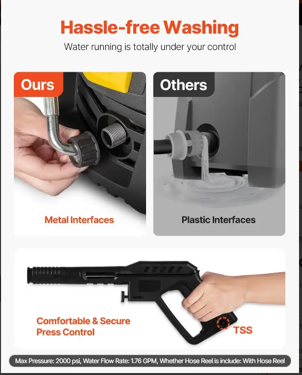 ·Provide Security for You: Are you tired of your energy depleting rapidly? Well, get ready to run longer and better. Built-in TSS (Total Stop System) automatically shuts off the pump when the trigger is not engaged to save energy and prolong the service time of the electric power washer. A press-type security lock prevents the spray gun from being engaged accidentally. We recommend not using it for over 3 hrs at a time.