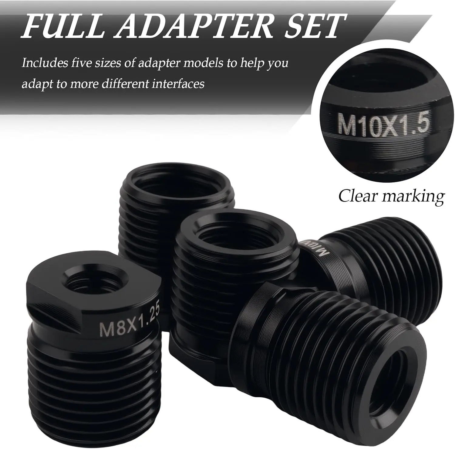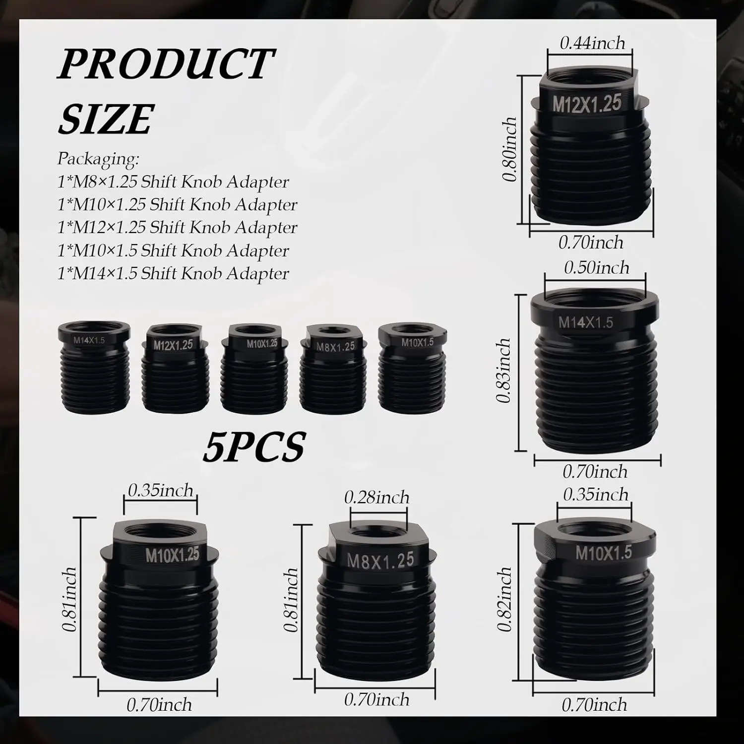 Includes 5 adapters: M8×1.25, M10×1.25, M12, M10×1.5, M14. OD size is M18×1.5. Check your shift knob and stick threads.