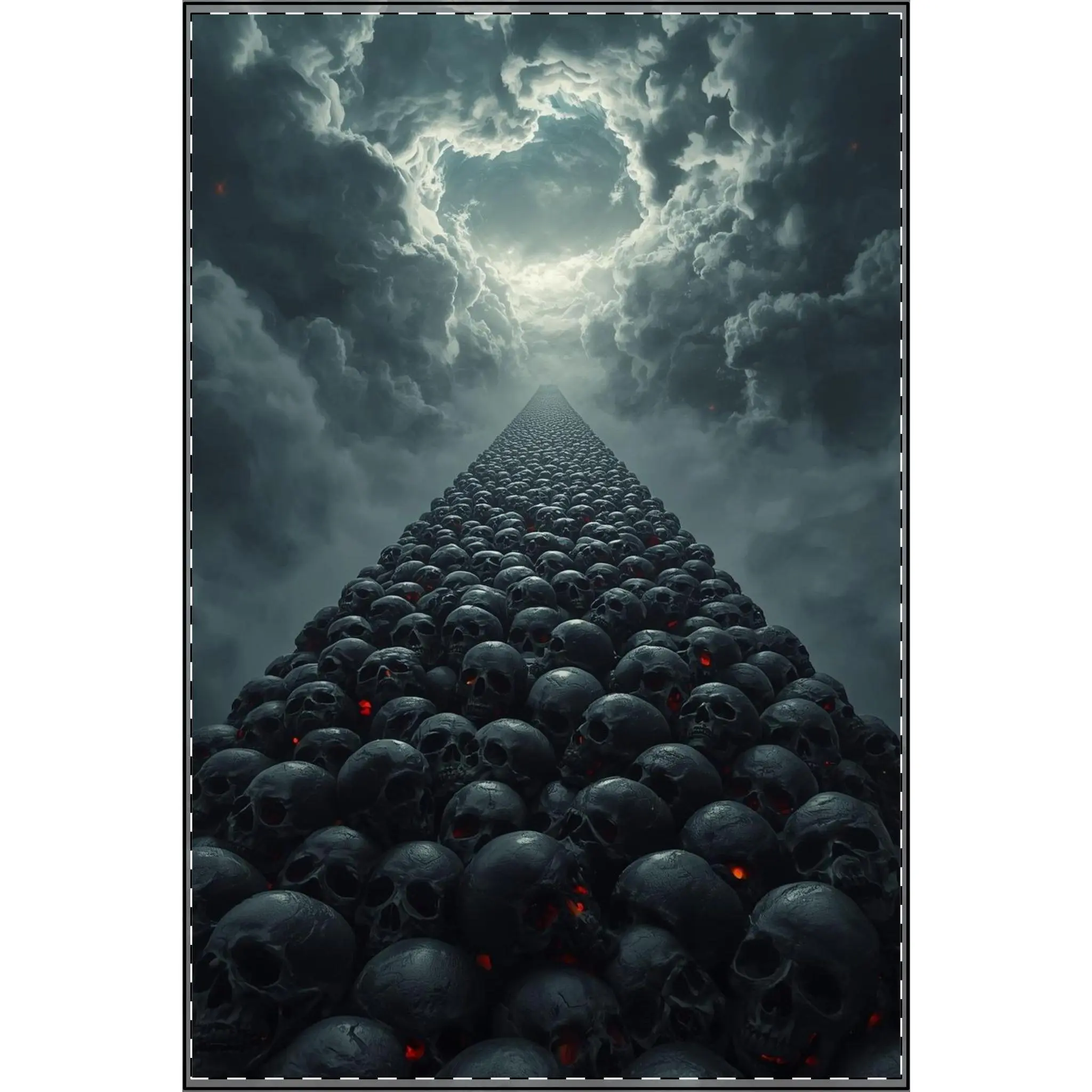 A satin-finish art poster that draws you in and holds your gaze. Deep, moody tones and a soft, low-glare sheen bring out layered shadows and tiny highlights — every skull and cloud reads with quiet depth. Printed on heavy 275 GSM satin paper, the image keeps a refined, museum-like look while resisting reflection from room lights. Hang it in a dim reading nook, a moody hallway, or above a console to set an atmospheric, cinematic mood that lingers.