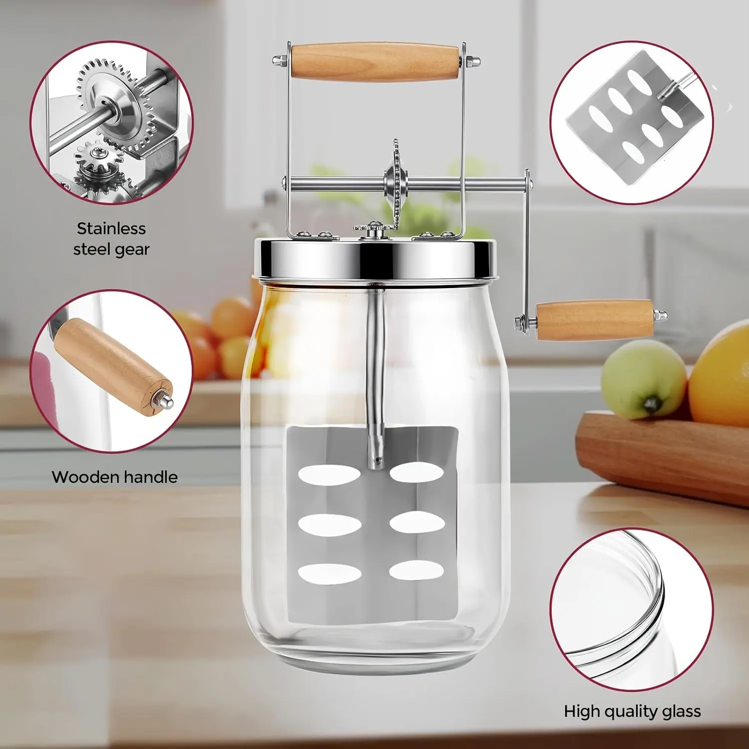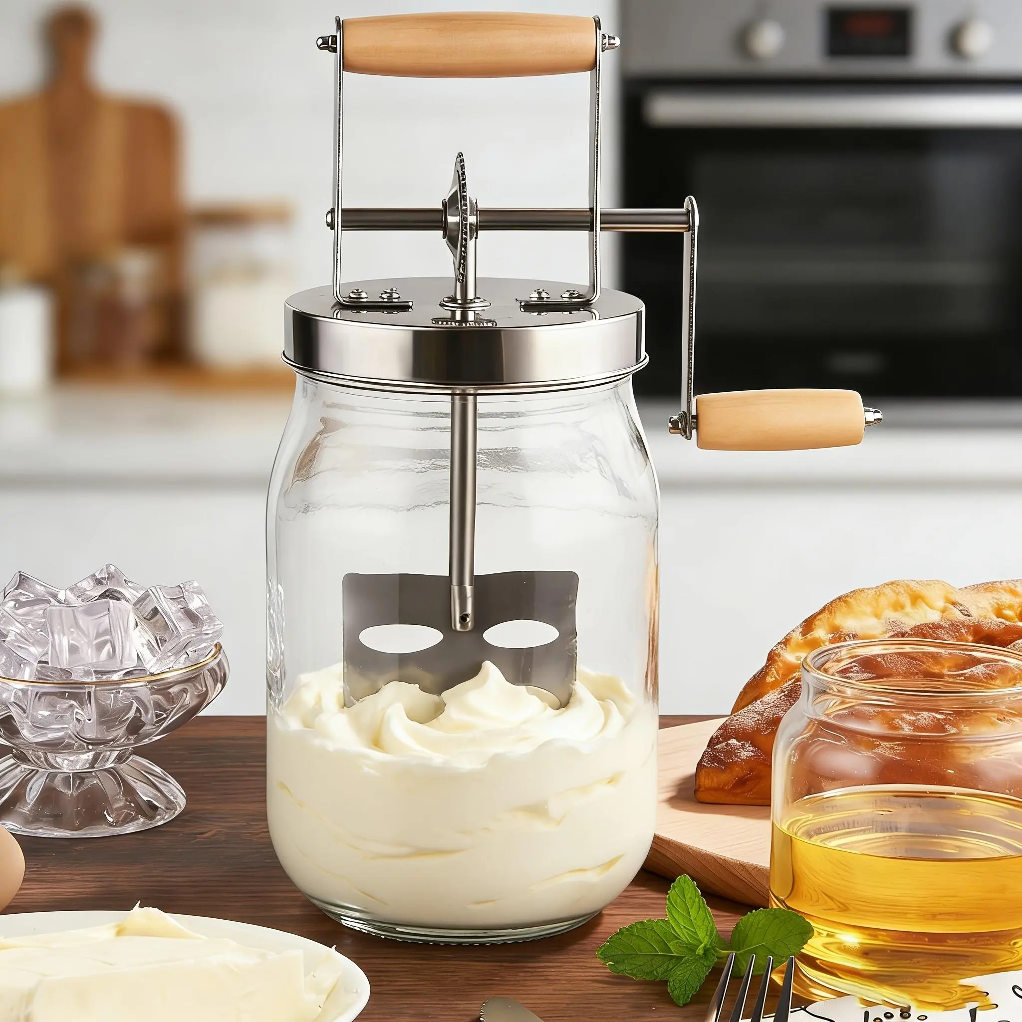 Handheld Butter Churner with Wooden Handle and Stainless Steel Gears, Handheld Butter Mixer, Milkshake Blender, Baking Tool Butter Maker