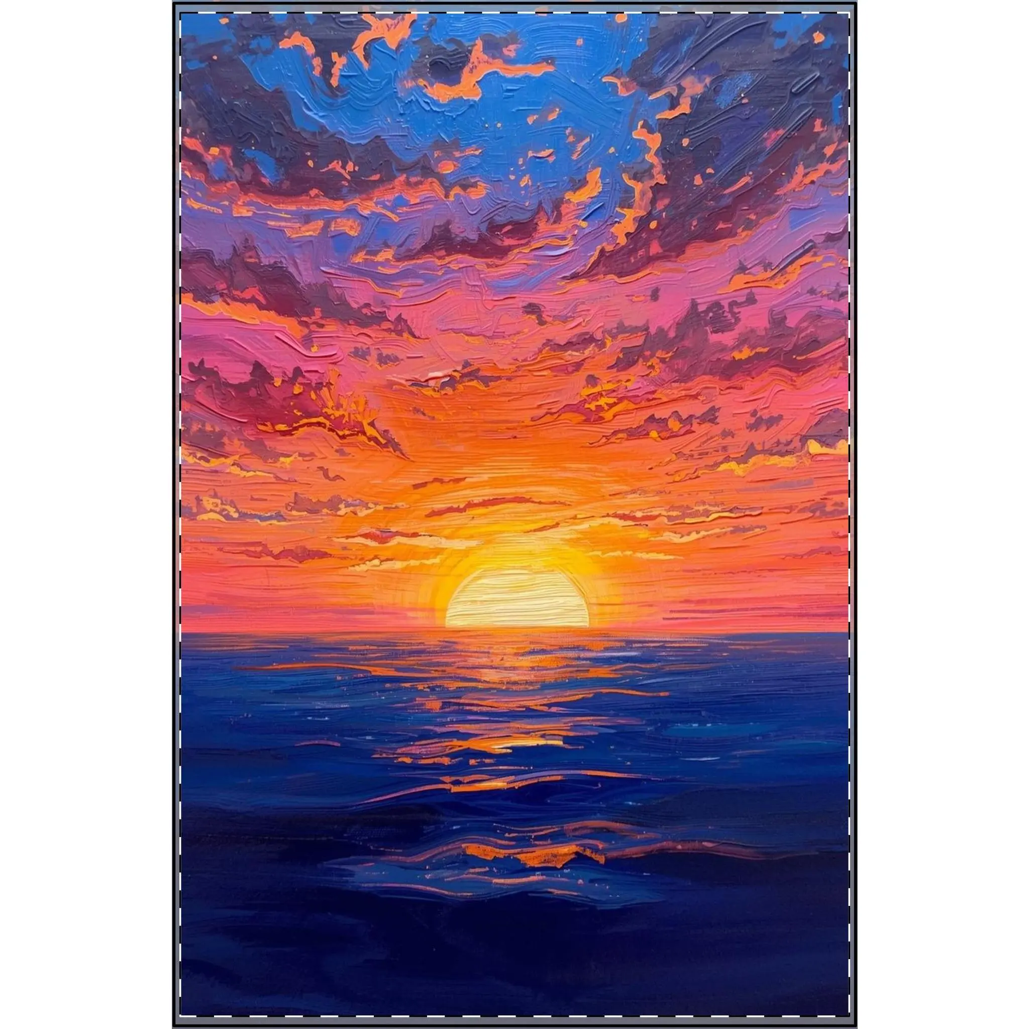 This satin poster brings a warm, painterly sunset into a room and holds attention without stealing it. The low-glare satin surface softens reflections so the colors — molten gold, coral, and deep indigo — read clearly from different angles. Thick 275 GSM paper gives the piece a tactile weight that feels like an art print rather than a flimsy poster. Hang it in a reading nook, over a desk, or inside a cozy living room to create a calm, contemplative corner where evening light lingers year-round. Designed for indoor display, it pairs especially well with natural wood frames and textured walls, enhancing the sense of depth in the brushstroke-like waves and cloudscape.