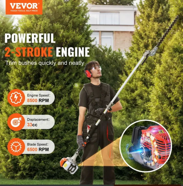 ·Efficient Hedge Trimming: Featuring a powerful 2-stroke engine with a 33CC displacement and 8500 RPM speed, this gas hedge trimmer delivers robust performance. The blade speed reaches up to 6500 RPM, ensuring sharp and efficient trimming. It's ideal for quickly trimming high branches, shrubs, tea gardens, and landscaping maintenance.
