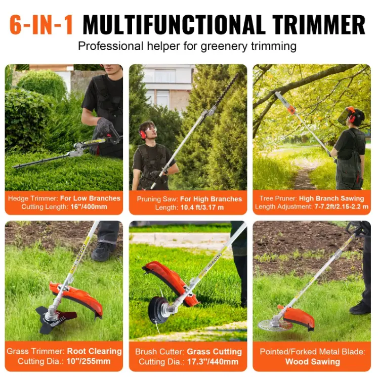 ·6-in-1 Multi-Function: This versatile tool includes a hedge trimmer, pruner, pole saw/chain saw, brush cutter, metal blade, and trimmer head. It is perfect for trimming bushes, branches, tea gardens, shaping greenery, sawing wood, cutting grass, and weeding. It's an excellent helper for maintaining your yard, garden, hedges, and park lawns.