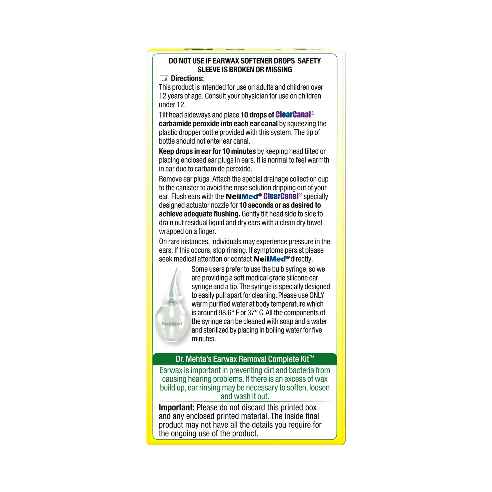 This product is intended for use on adults and children over 12 years of age. Consult your physician for use on children under 12. Tilt head sideways and place 10 drops into each ear canal by squeezing the plastic dropper bottle provided with this system. The tip of bottle should not enter ear canal. Keep drops in ear for 10 minutes by keeping head tilted or placing enclosed ear plugs in ears. It is normal to feel warmth in inner ear. Remove ear plugs. Attach the special drainage collection cup to the canister to avoid the rinse solution dripping out of your ear. Flush ears with the NeilMed® ClearCanal® specially designed actuator nozzle for 10 seconds or as desired to achieve adequate flushing. Gently tilt head side to side to drain out residual liquid & dry ears with a clean dry towel wrapped on a finger.