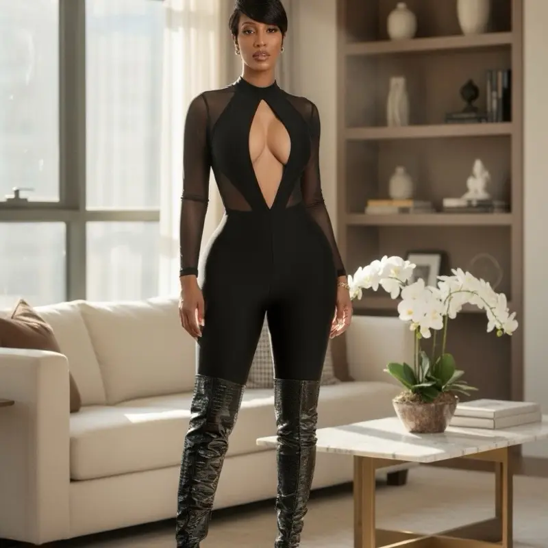 THE HOLLOW-OUT SEE THROUGH BACKLESS FITTED JUMPSUITS BLENDS CASUAL CHARM WITH A TOUCH OF SEXINESS, MAKING IT A DYNAMIC ADDITION TO ANY WARDROBE. CRAFTED FROM 85% PREMIUM GAUZE, TERYLENE, POLYESTER, SPANDEX, MILK FIBER, THIS JUMPSUIT IS SOFT, STRETCHY, AND INCREDIBLY COMFORTABLE. ITS BREATHABLE, EASY-CARE FABRIC IS PERFECT FOR ACTIVE DAYS OR LAID-BACK EVENINGS. THE SLEEK AND VERSATILE DESIGN MAKES IT AN IDEAL PICK FOR DAILY WEAR, FITNESS SESSIONS, CASUAL OUTINGS, OR EVEN CLUB NIGHTS