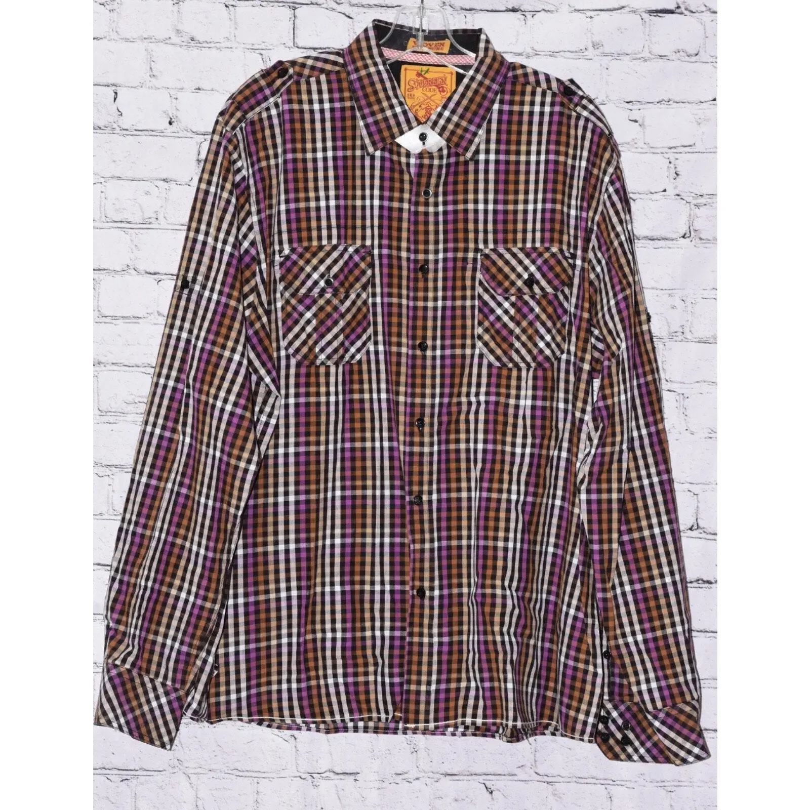 Western style * Barrel cuffs * Signature buttons * Roll-up sleeve button * Plaid pattern, brown, tan, purple & colors * New without tags