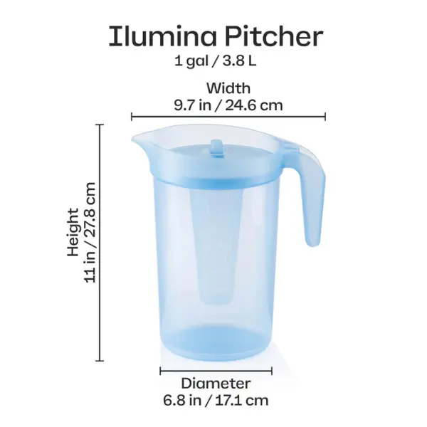 Serve and store refreshing drinks with ease using the Tupperware Ilumina 1-Gallon Pitcher. Includes a built-in infuser for added flavor, plus a push-button lid and angled spout to help reduce spills.