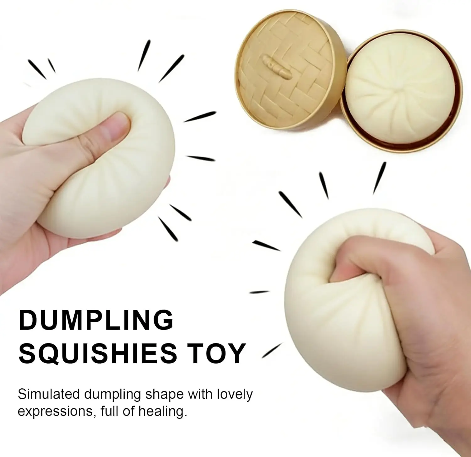 ·【Included Steamer Box】This giant squishy dumpling comes with a decorative steamer basket package of its own, which looks remarkably genuine—making the dumpling squishy look like it has just been steamed and is ready for play.
