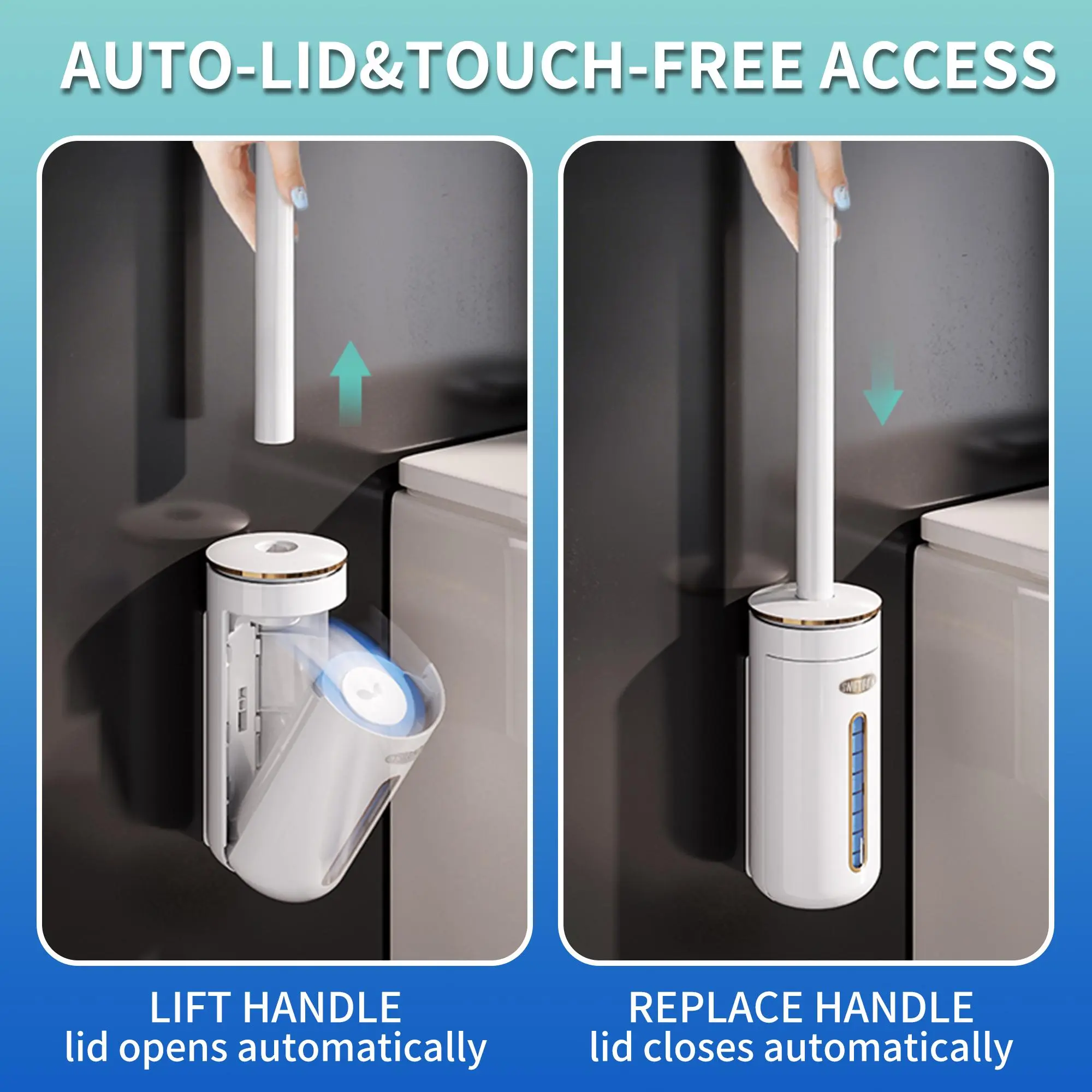 Disposable Toilet Brush Set with 6 Refills, Touch-Free Toilet Cleaning Wand with Foaming Sponge Heads, Wall-Mounted No-Drill Holder with Auto-Open/Close Lid, 3- Layer Scrubbing Pads, Bathroom Toilet Bowl Cleaner Kit