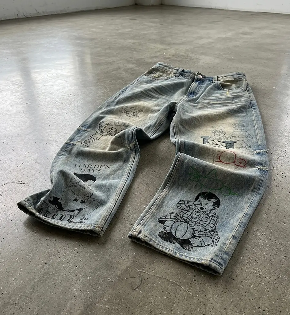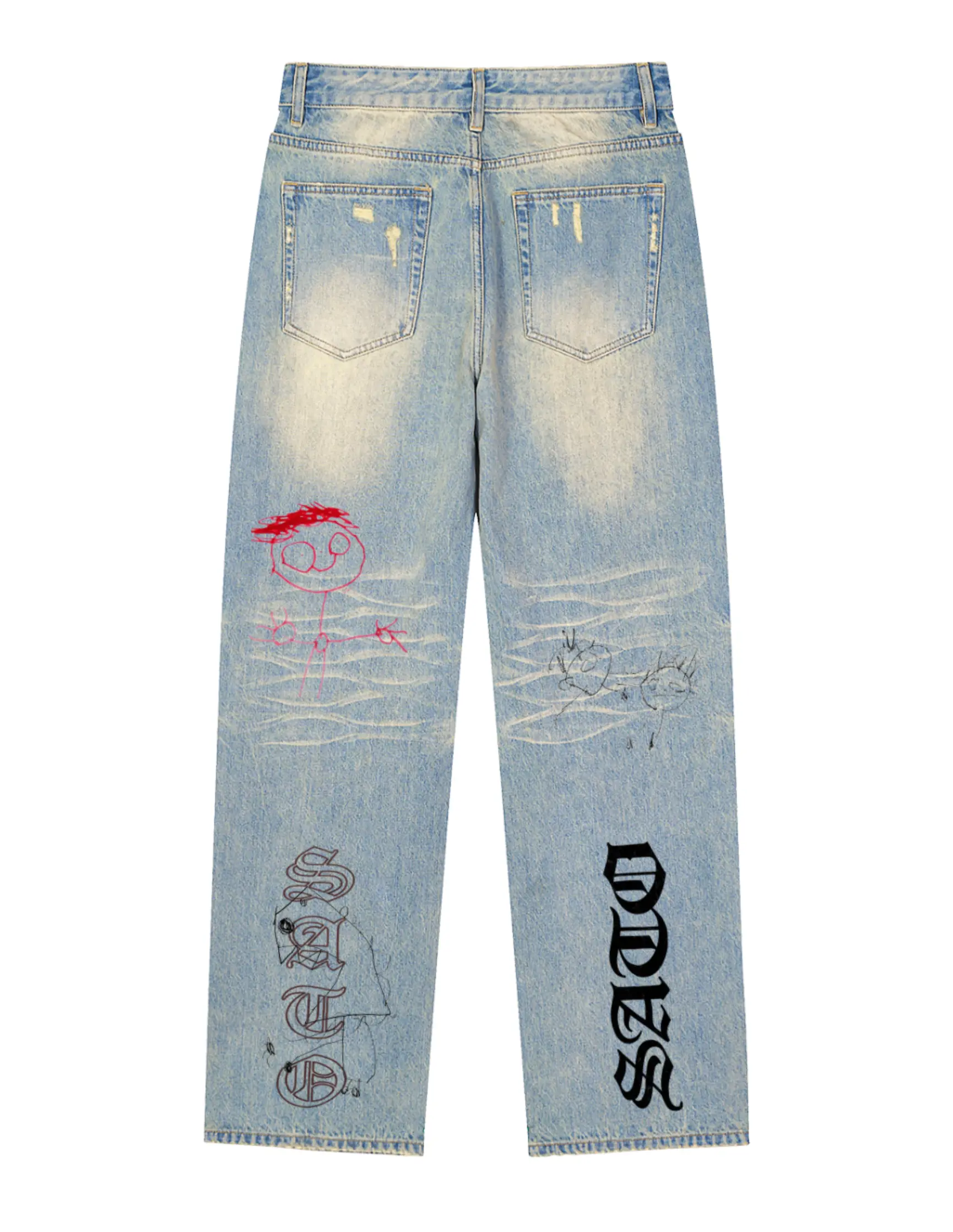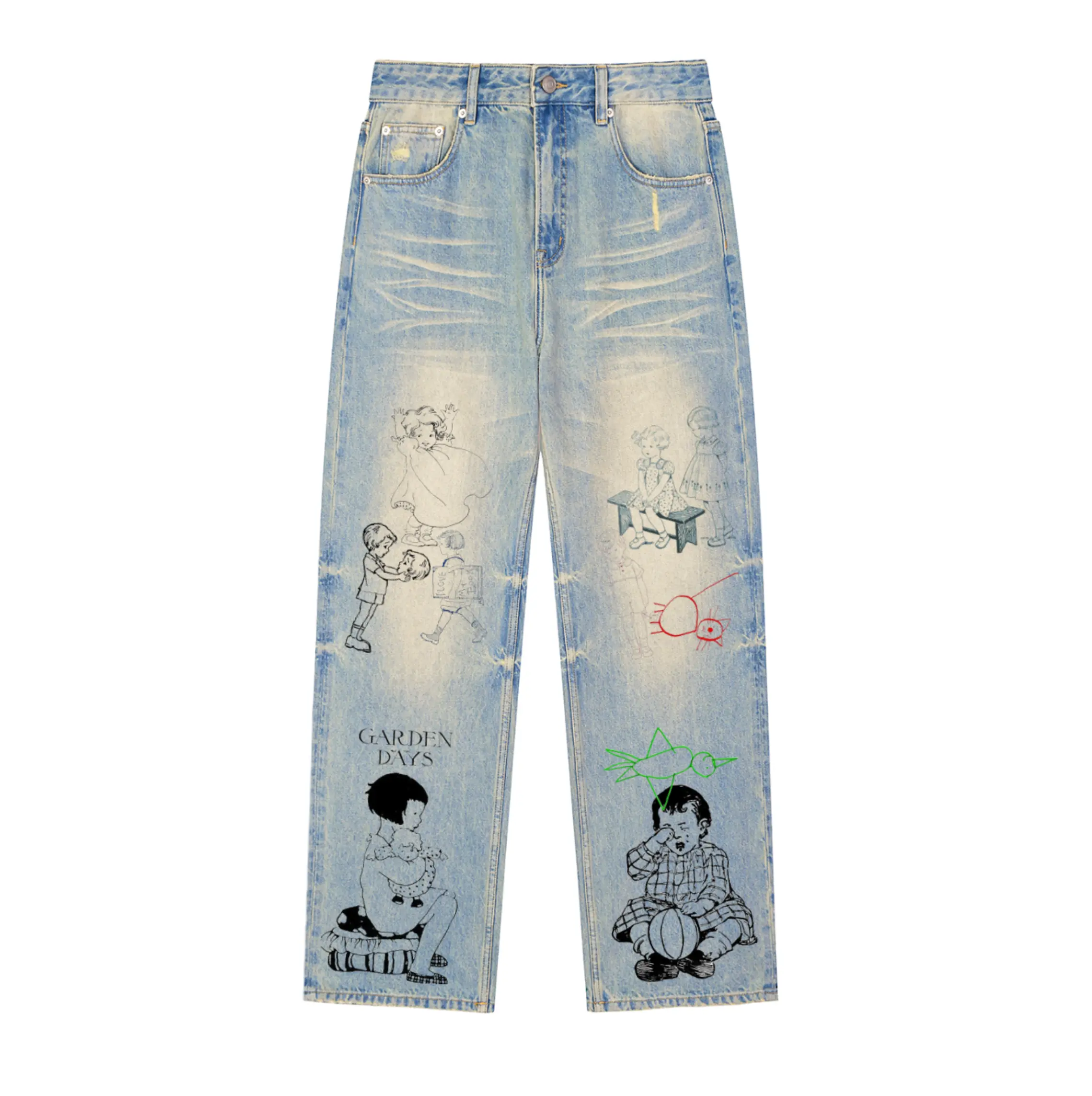 Vintage wash straight leg denim. Vintage children's illustrations scattered on both legs - children, figures, red eye and green neon arrow as the only color accents. "Garden Days" as a signature on the left leg.