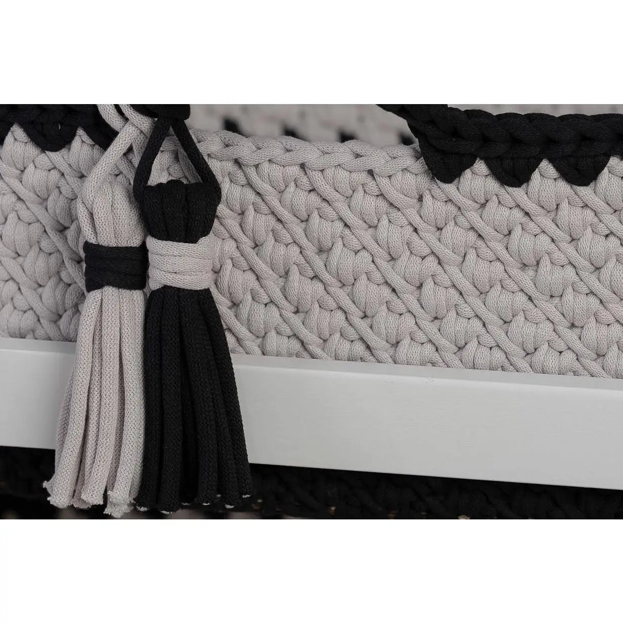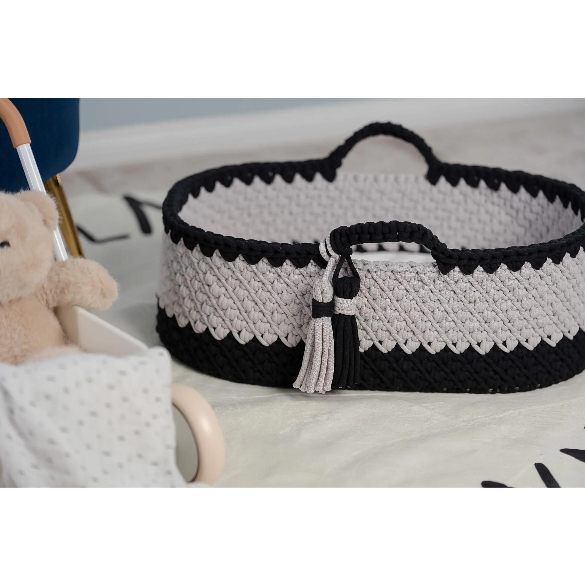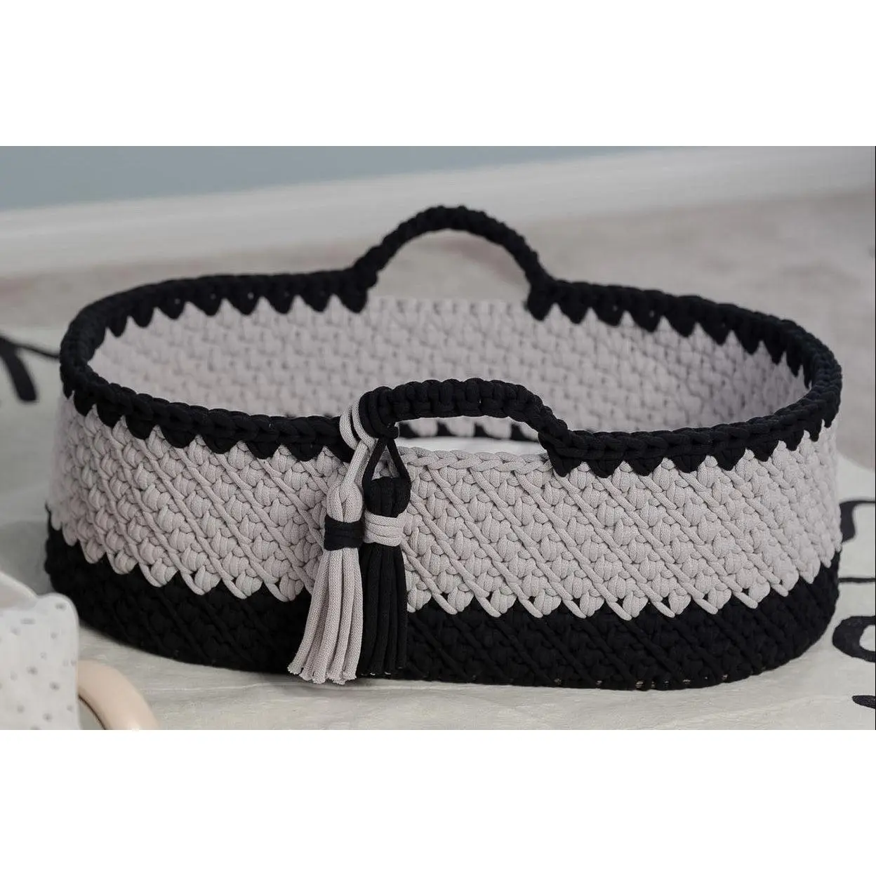 Handcrafted with care, this baby Moses basket features a sturdy wooden base and is beautifully crocheted using premium 9mm Bobbiny cord made from 100% OEKO-TEX® certified cotton. Designed with both style and safety in mind, it offers a soft, breathable, and chemical-free environment for your little one. Each basket is thoughtfully made to be gentle for delicate skin while providing lasting durability and timeless charm for your nursery. The sturdy wooden base ensures stability and long-lasting support, while the gently curved hood creates a snug, sheltered environment—perfect for naps, lounging, or capturing those precious newborn moments.