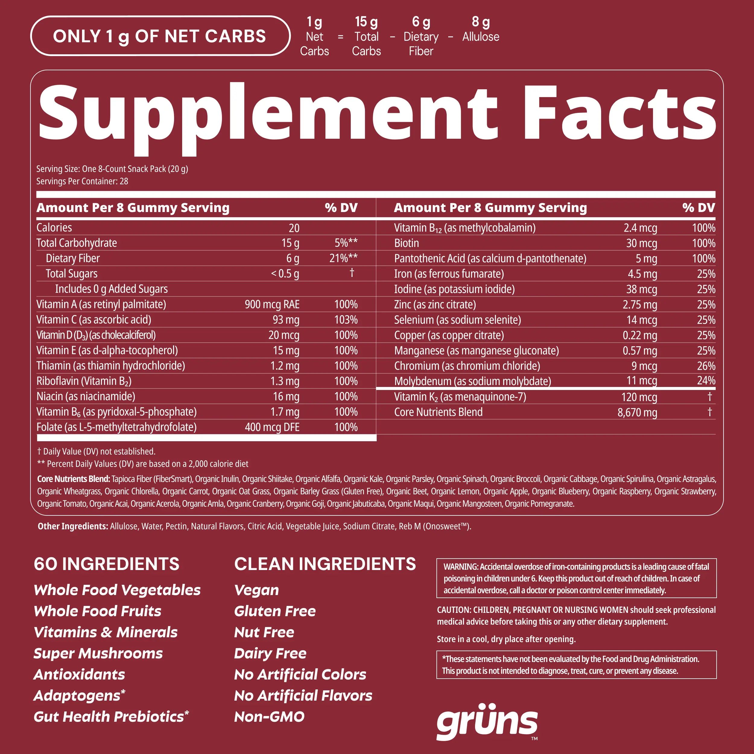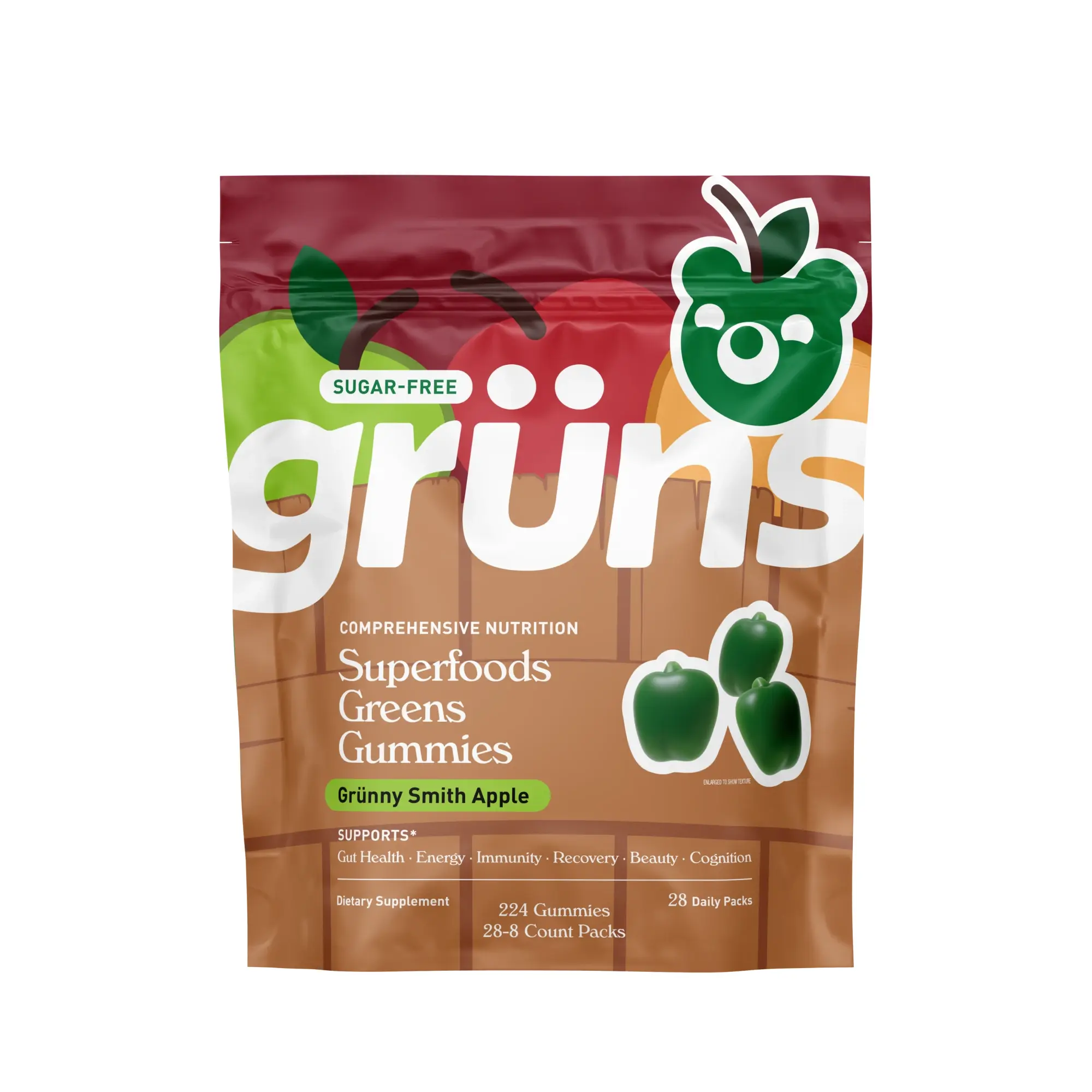 Directions Each large pouch of Grüns contains 28 individual snack packs. Grab a single snack pack daily and enjoy the small handful of green apple gummy bears inside for comprehensive nutrition.