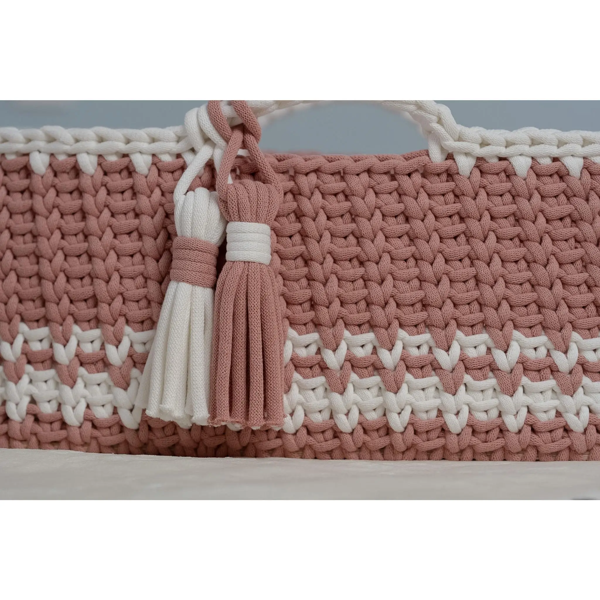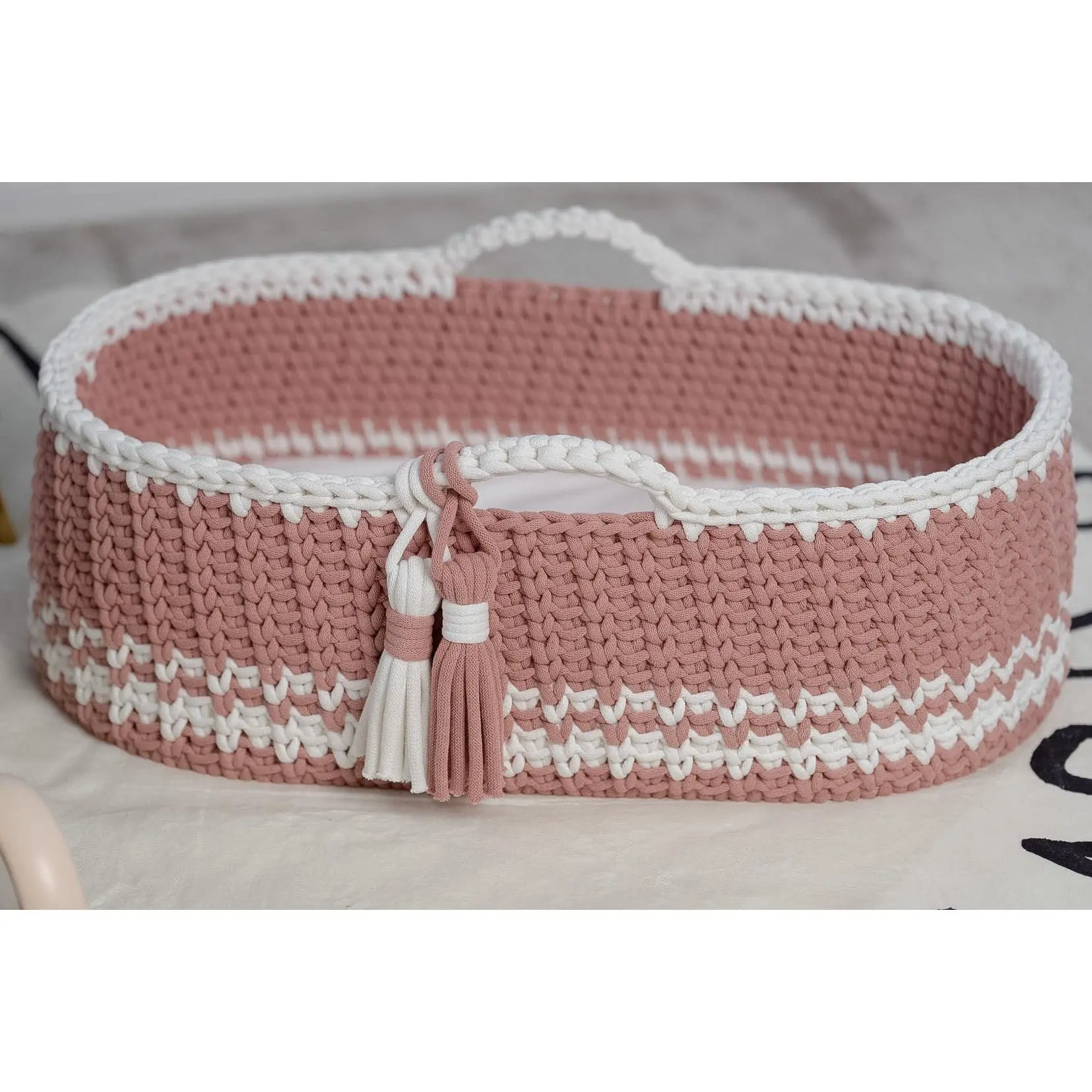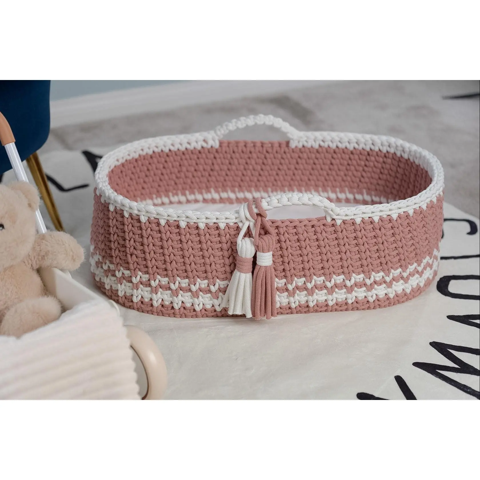 Handcrafted with care, this baby Moses basket features a sturdy wooden base and is beautifully crocheted using premium 9mm Bobbiny cord made from 100% OEKO-TEX® certified cotton. Designed with both style and safety in mind, it offers a soft, breathable, and chemical-free environment for your little one. Each basket is thoughtfully made to be gentle for delicate skin while providing lasting durability and timeless charm for your nursery. The sturdy wooden base ensures stability and long-lasting support, while the gently curved hood creates a snug, sheltered environment—perfect for naps, lounging, or capturing those precious newborn moments.