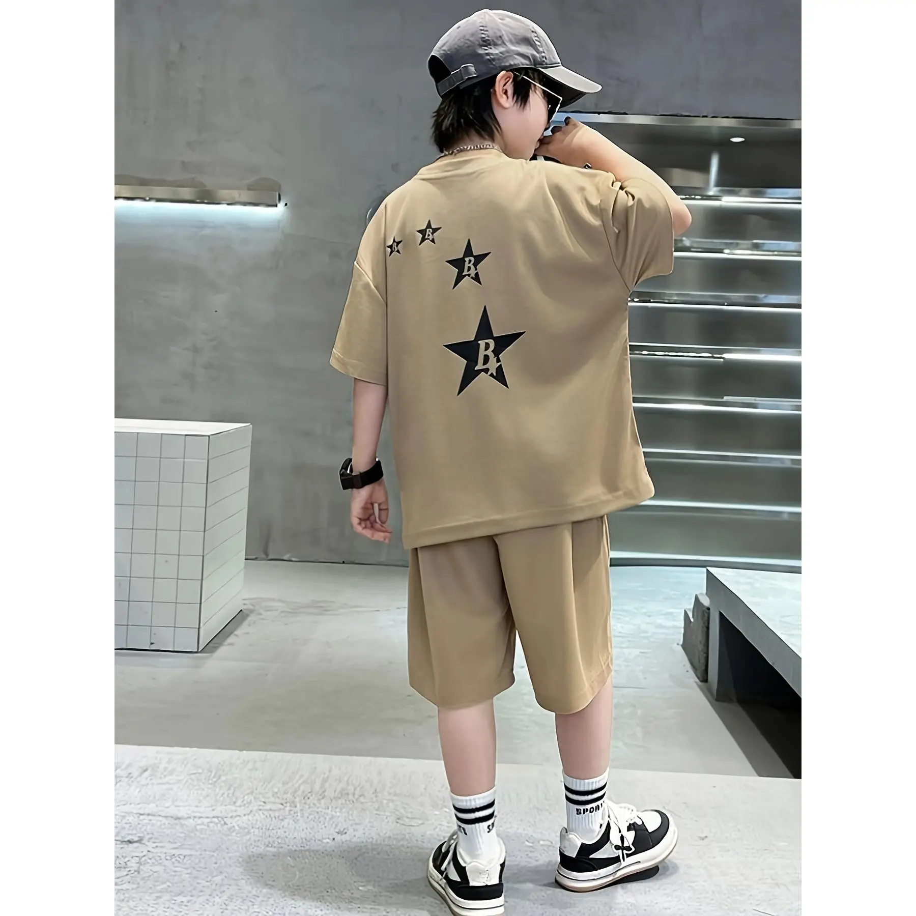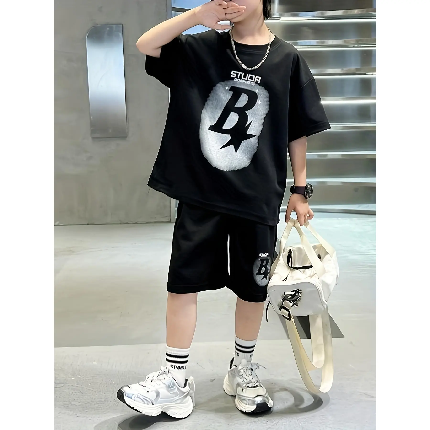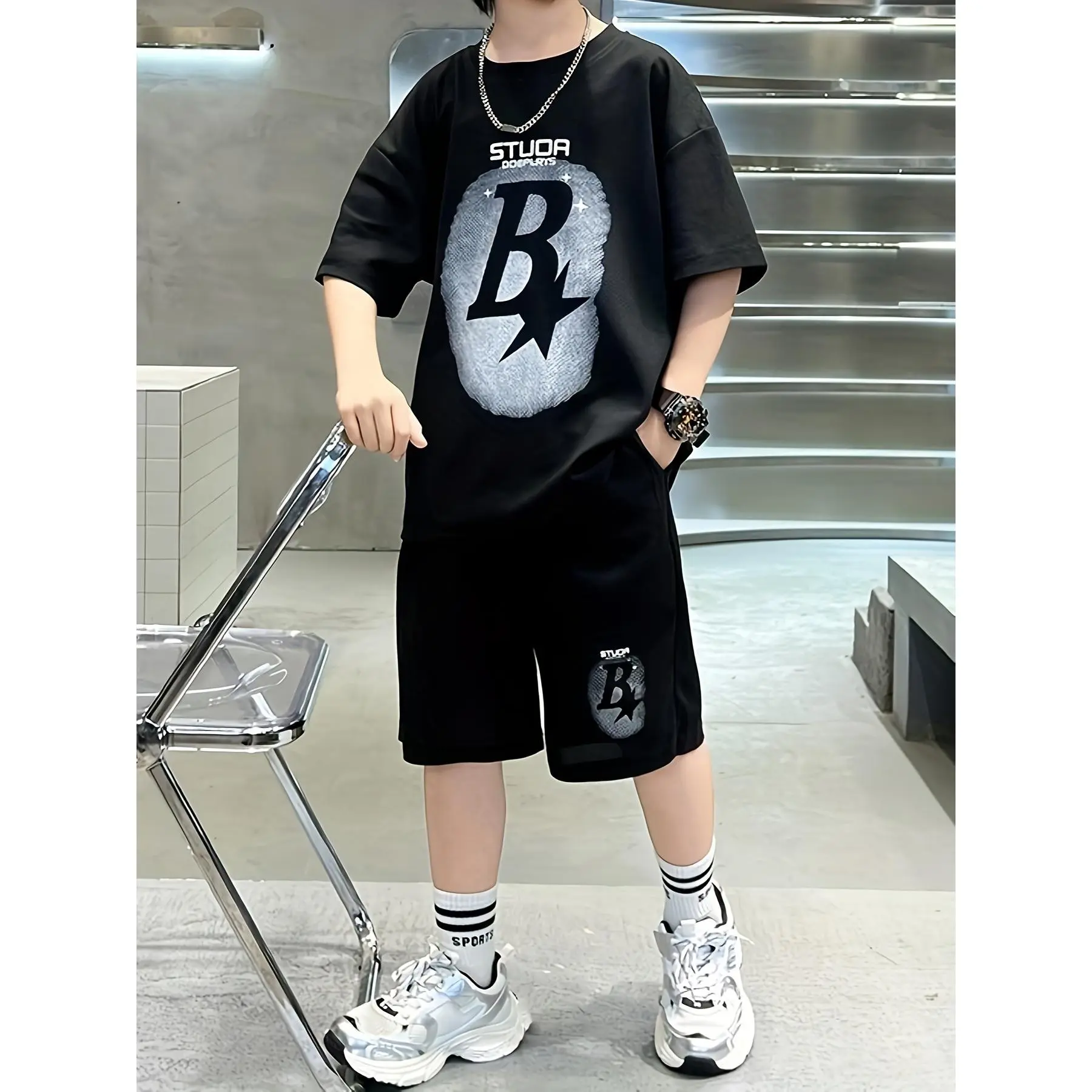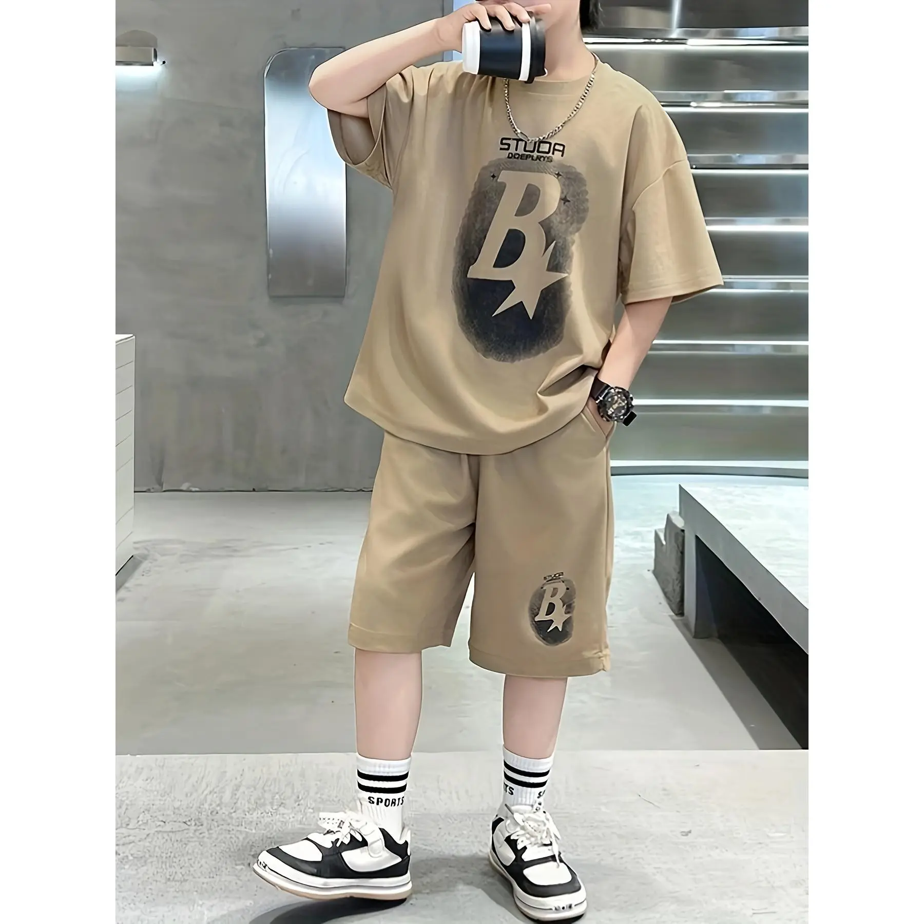 Two-piece Set of Men's Children's Summer Short Sleeves and Shorts, Sports, Leisure, Comfortable and Fashionable Men's Large Children's Printed Loose Short Sleeves and Shorts
