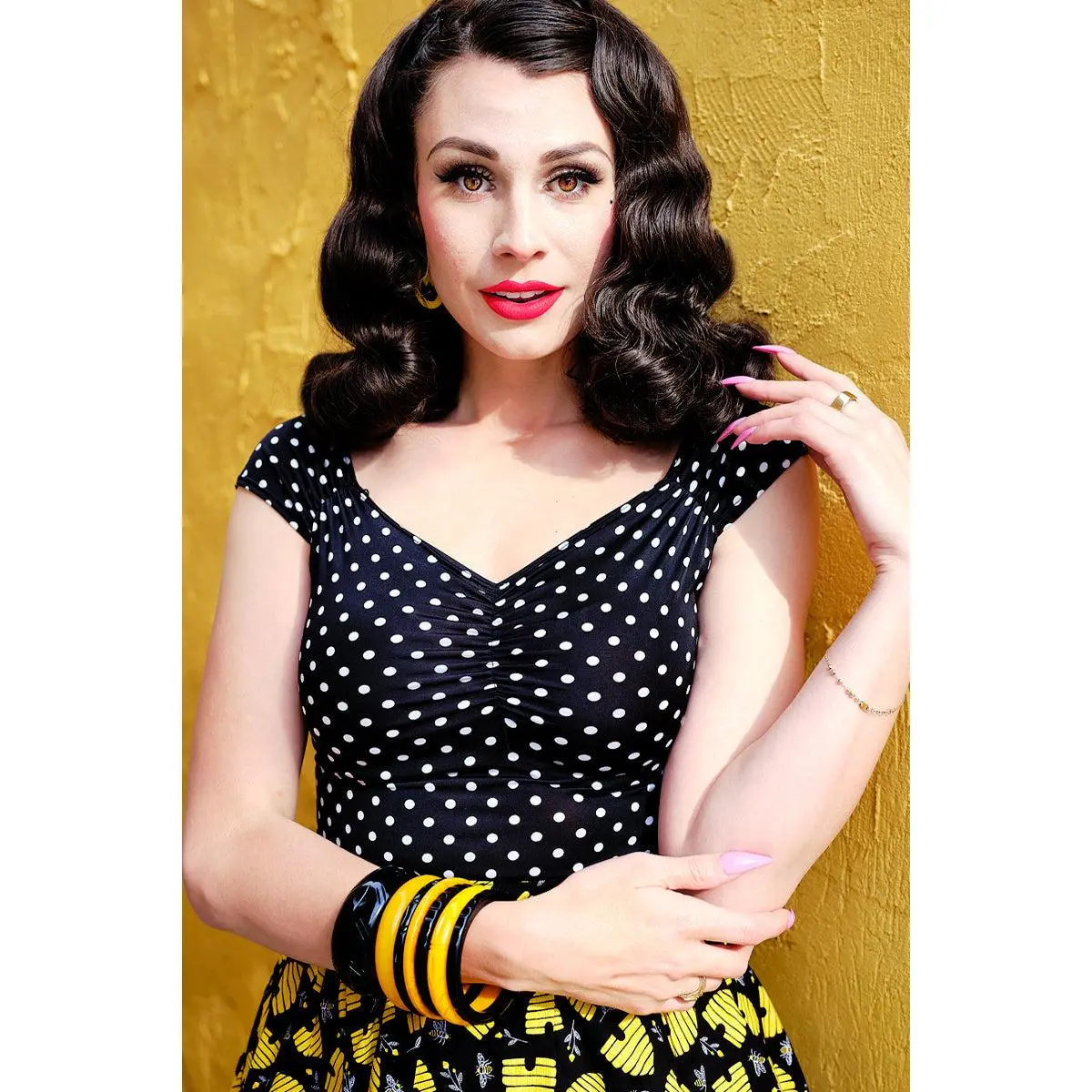 Looking for a pinup-approved top? Well look no further: the Isabel top is a 1950's staple with modern features! This super soft and stretchy top features a figure-flattering sweetheart neckline, shirring at the bust and on the sleeves, and is a pullover style with no zippers or buttons. Pair with a swing skirt for the ultimate retro ensemble or your favorite jeans. The options are endless!
