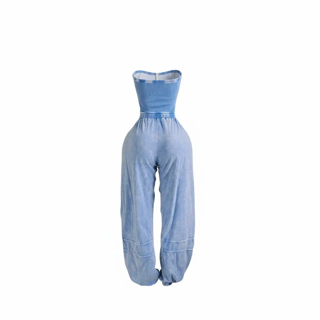 Effortless comfort meets contemporary style with this mineral wash strapless jumpsuit. The relaxed jogger silhouette offers an on-trend look, while functional pockets keep your essentials close. A faux waist tie adds definition and visual interest to the design. Crafted with stretch fabric, it moves with you for all-day wear. Perfect for casual outings, weekend getaways, or laid-back social moments.