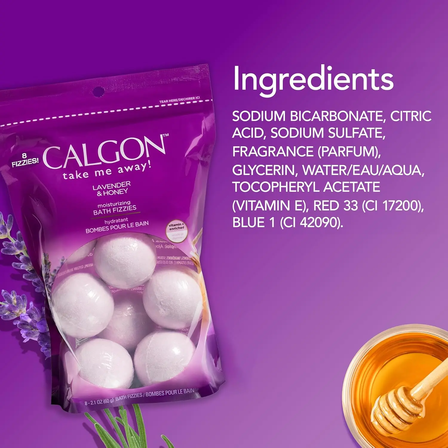·Unwind and indulge in a luxurious bath experience with Calgon Lavender & Honey Moisturizing Bath Fizzies. Each fizzy adds a fragrant effervescence of lavender and honey to your bath, while Vitamin E softens your skin, complemented by the calming fragrance of jasmine, rose, and musk. Simply add two bath fizzies to warm bath water and enjoy a relaxing bath experience.