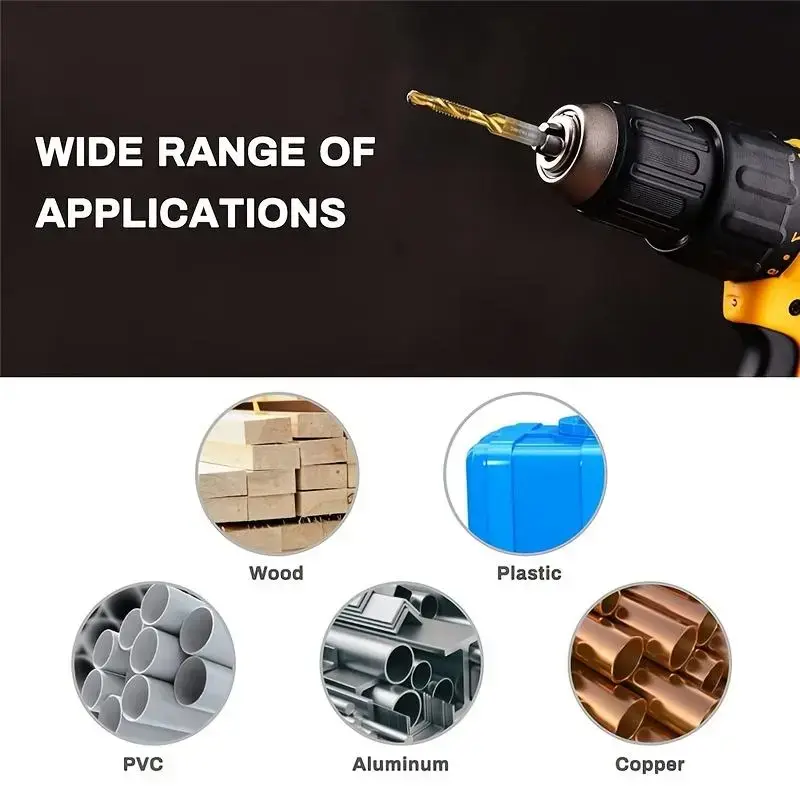 ·This tap set includes SAE , so it has high versatility. Each tap drill is engraved with a label, which is convenient for you to choose the size that suits you. The convenient ¼-inch (6.35mm) quick change hex shank has a tapered end to prevent excessive knocks. Back taper exceeds the tap to prevent over-drilling and damage to the thread.