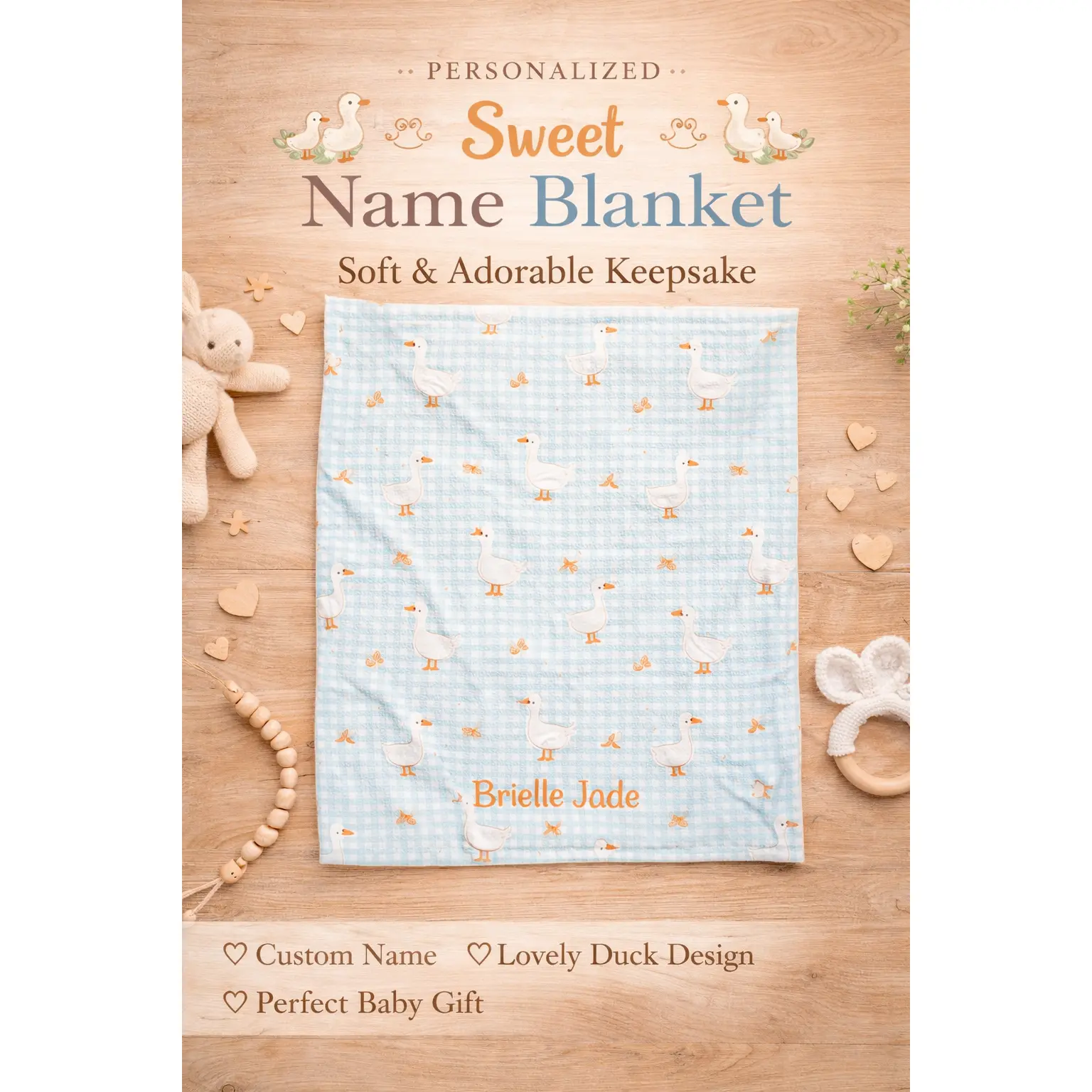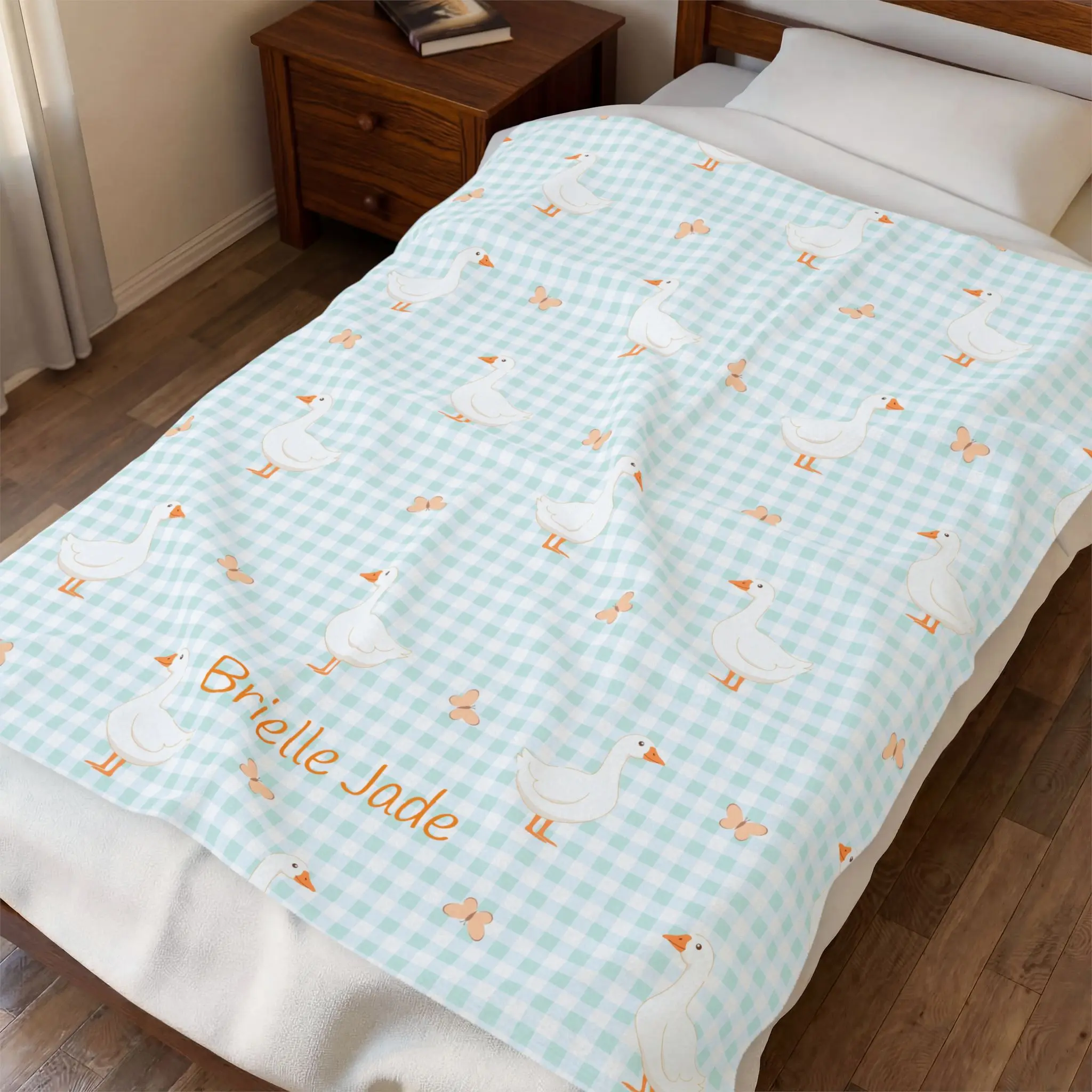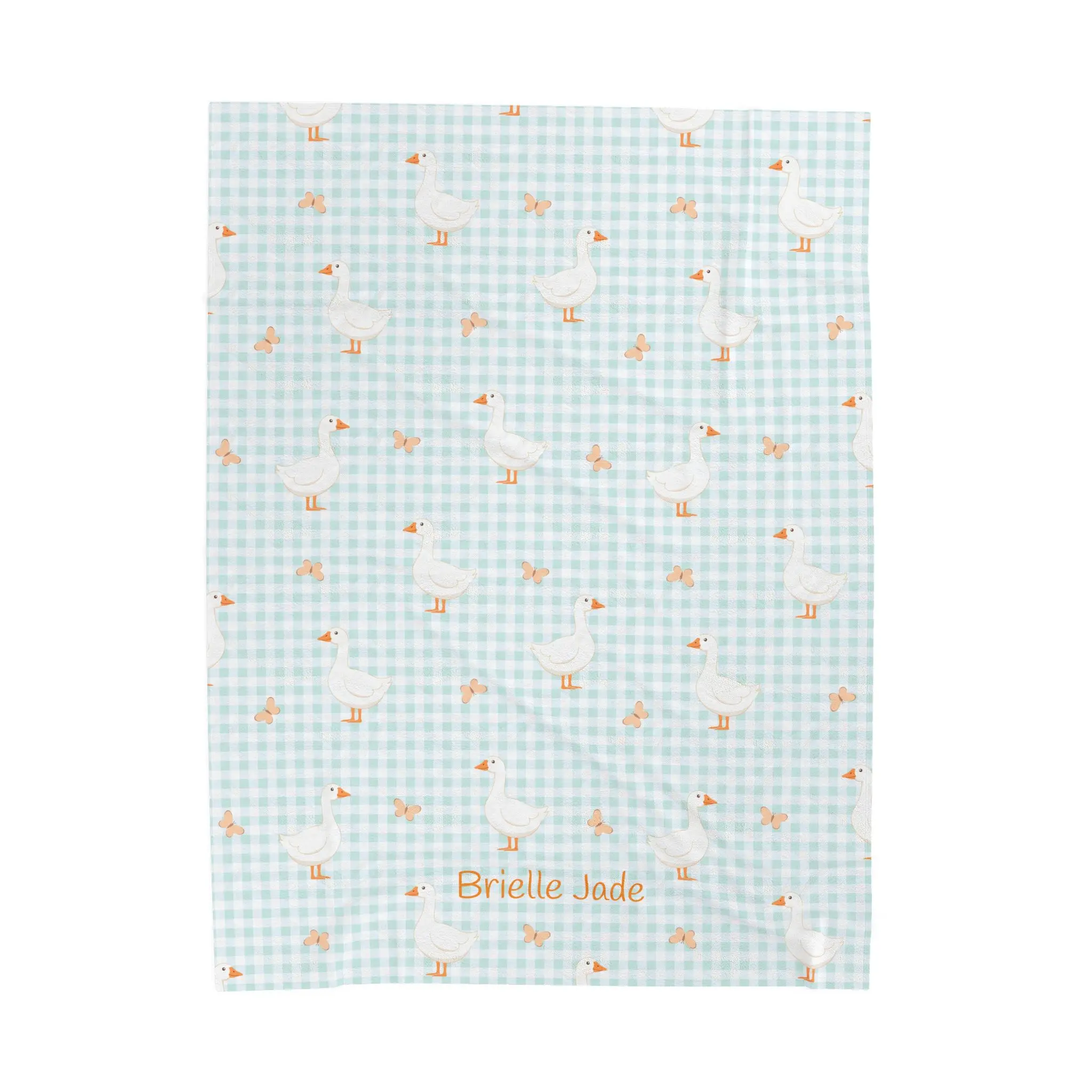 A velvety, cloud-soft blanket that brings quiet comfort to nursery naps and slow evenings. Pale mint gingham forms the backdrop for a scatter of gentle white geese and tiny florals — an old-fashioned, storybook pattern softened for modern life. The plush face holds vivid, personalized embroidery (name shown) while the reverse stays clean and cozy. It drapes easily over a crib rail, stroller, or lap, and settles into the rhythm of nightly routines: calming fussy moments, marking a newborn’s first photos, or becoming the go-to comfort layer for sleepy parents. Lightweight but warm, it wears well through washes and keeps its color and stitch integrity thanks to reinforced seams. If you treasure sweet, low-key design and tactile softness that comforts at a touch, this blanket fits naturally into quiet mornings and tender bedtime rituals.