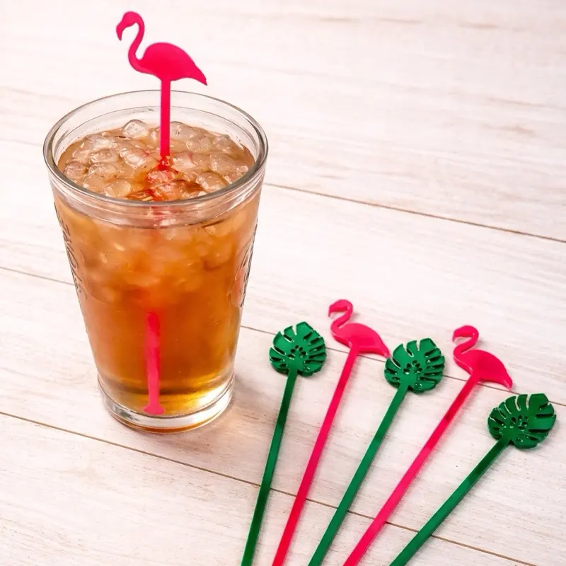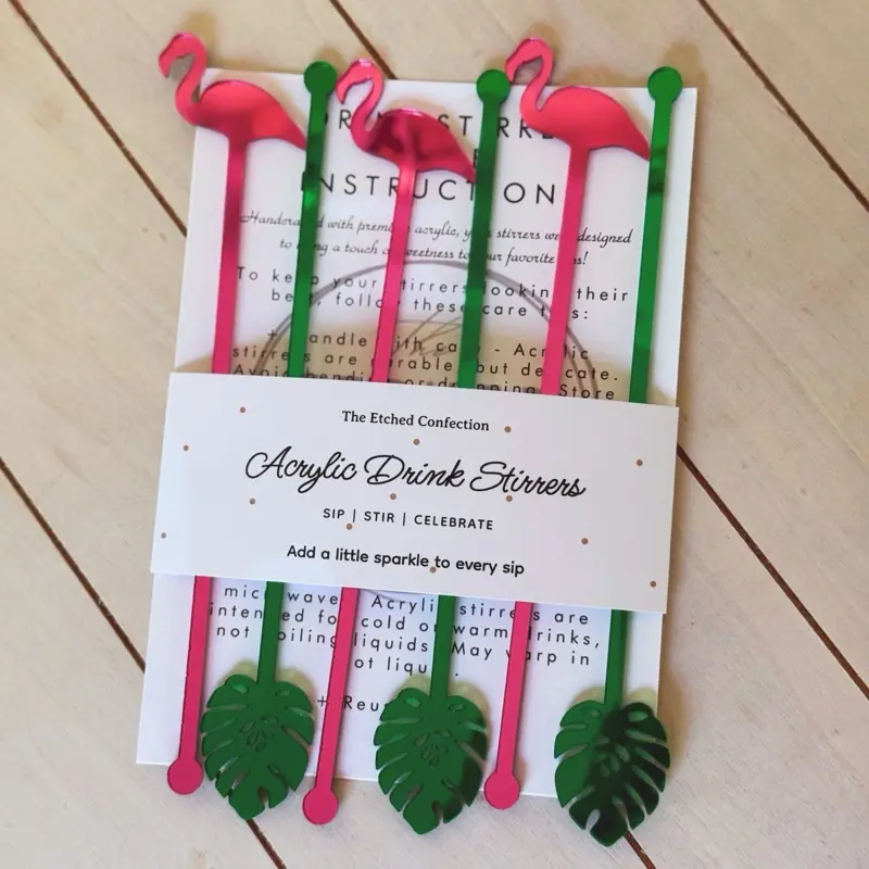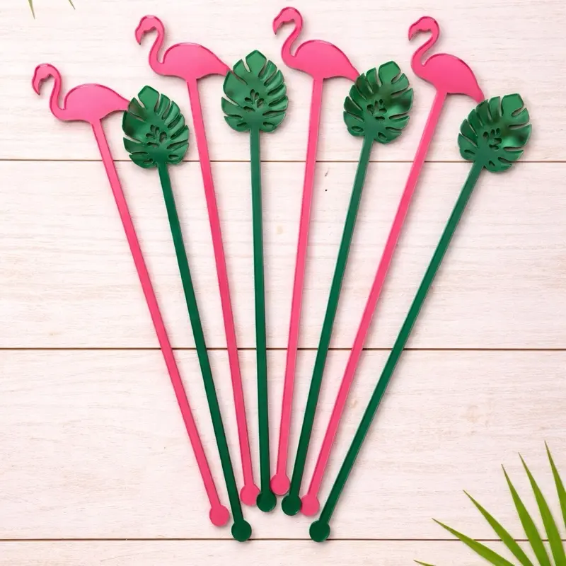 Each set includes 6 acrylic drink stirrers in a coordinating flamingo and leaf design to make your drinks, cocktails, mocktails, and party tables feel extra fun and styled.
