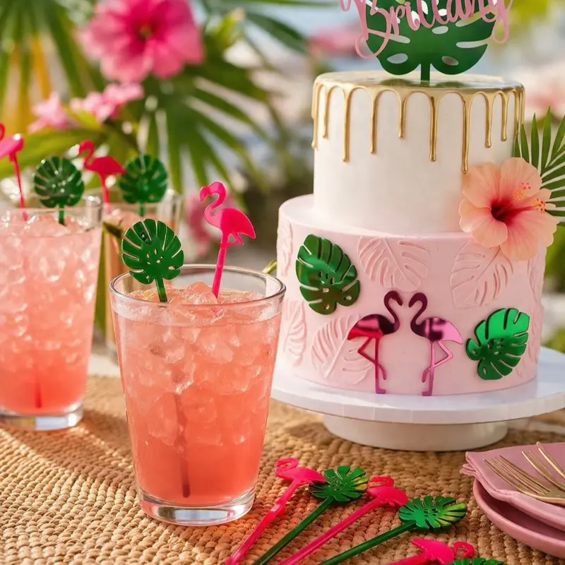 Add a tropical touch to your drinks with these flamingo and palm leaf drink stirrers, perfect for summer birthdays, pool parties, luau parties, flamingo-themed celebrations, and tropical bridal or baby showers.