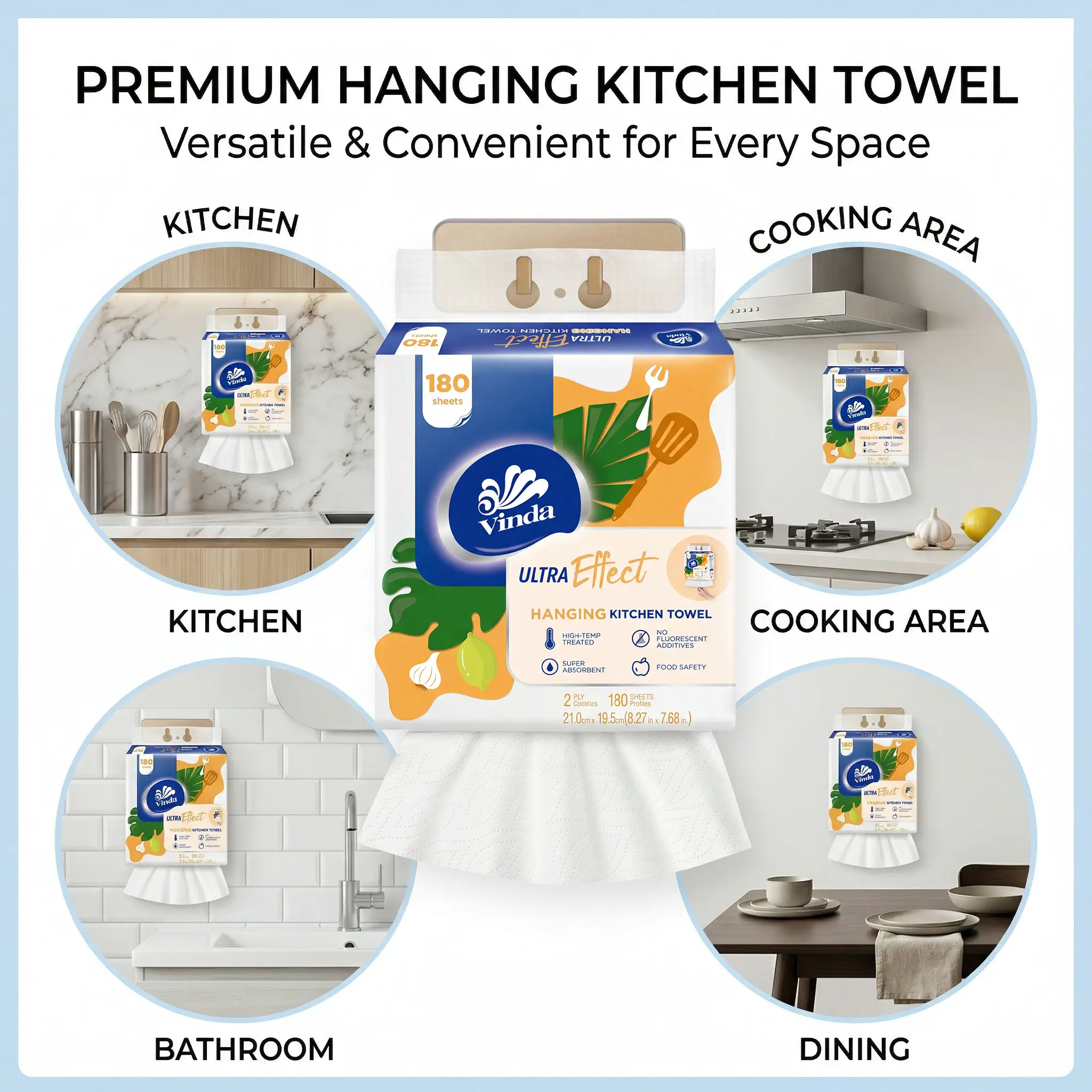 Vinda Hanging Kitchen Paper Towels with free hook -Quick Grab, Fully Protected, Saves Space| Ultra Water& Heavy Oil Absorbent Wipes, Washable & Extra Strong When Wet 2-Ply, 180Sheets/bag, 100% Virgin Pulp, Food Safe - TikTok Must-Have for Kitchens