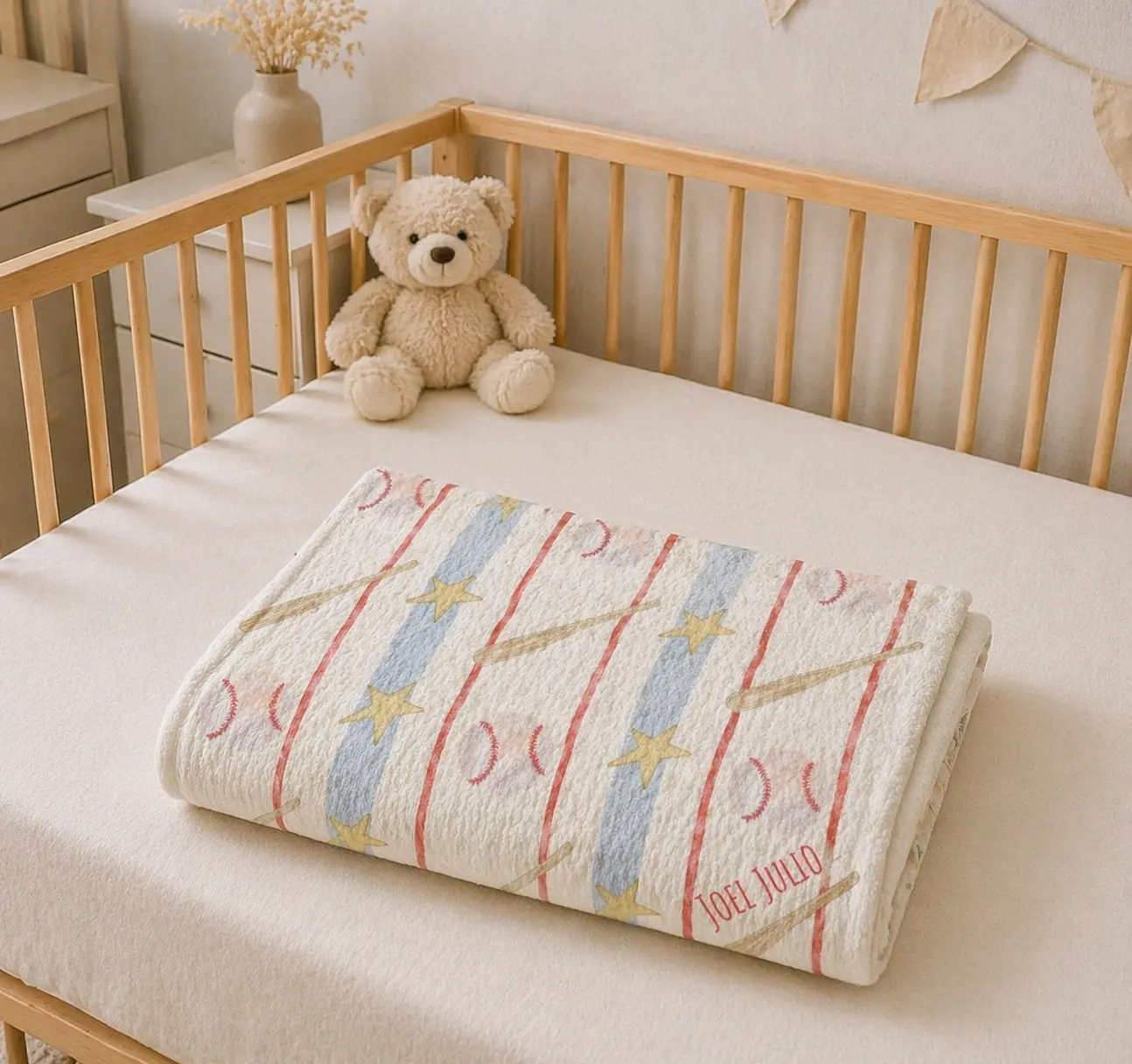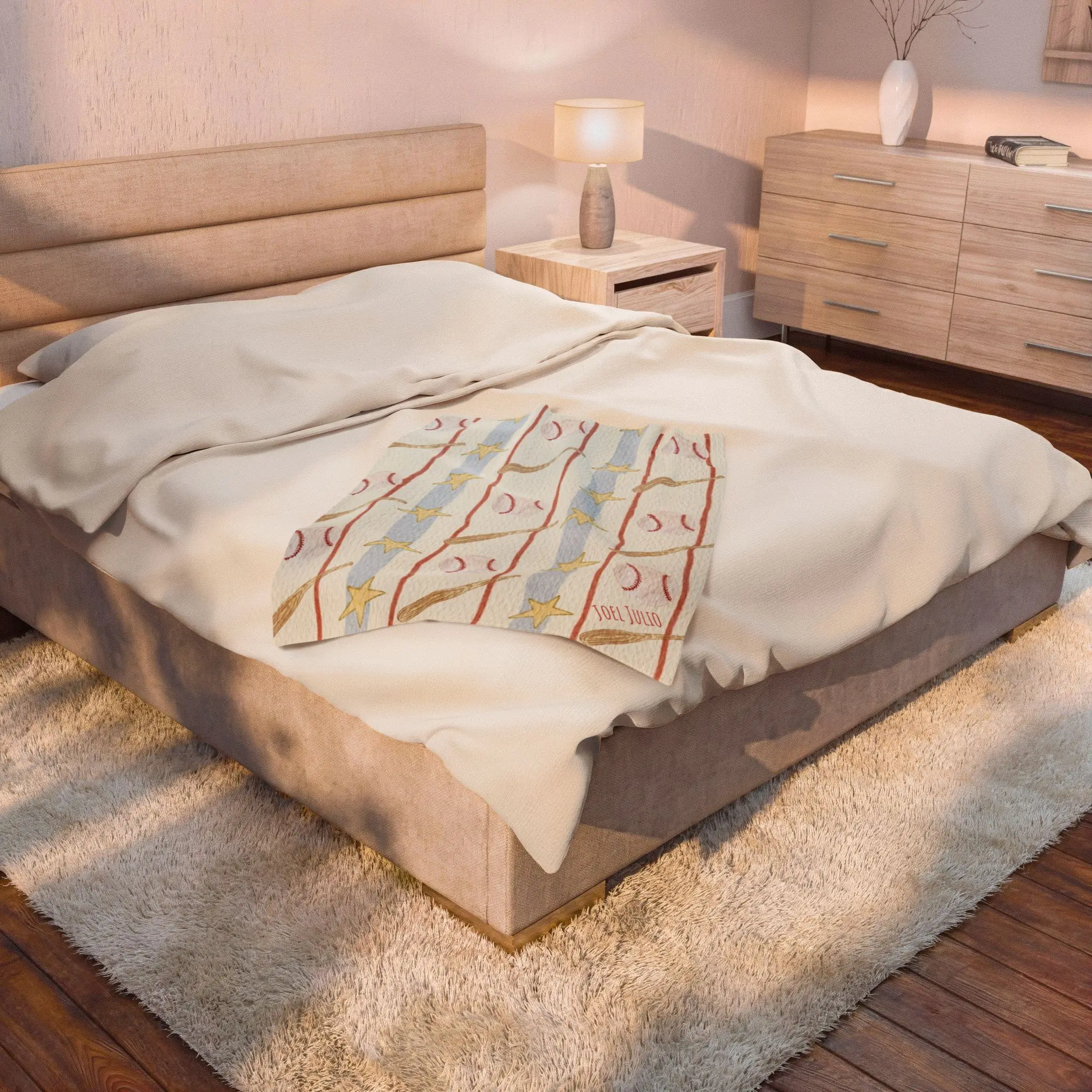 Wrap yourself in gentle, storybook calm. This velveteen plush blanket carries a hand-drawn stripe of soft pastels—muted blues, warm ochres, and blush pinks—interspersed with tiny star and ribbon motifs. It drapes easily over a couch or laps like a familiar companion during quiet mornings with tea, late-night reading, or slow weekend mornings. The surface feels velvety against the skin while the printed pattern keeps the mood light and slightly nostalgic, fitting into cozy, creative spaces where comfort and subtle artistry meet.