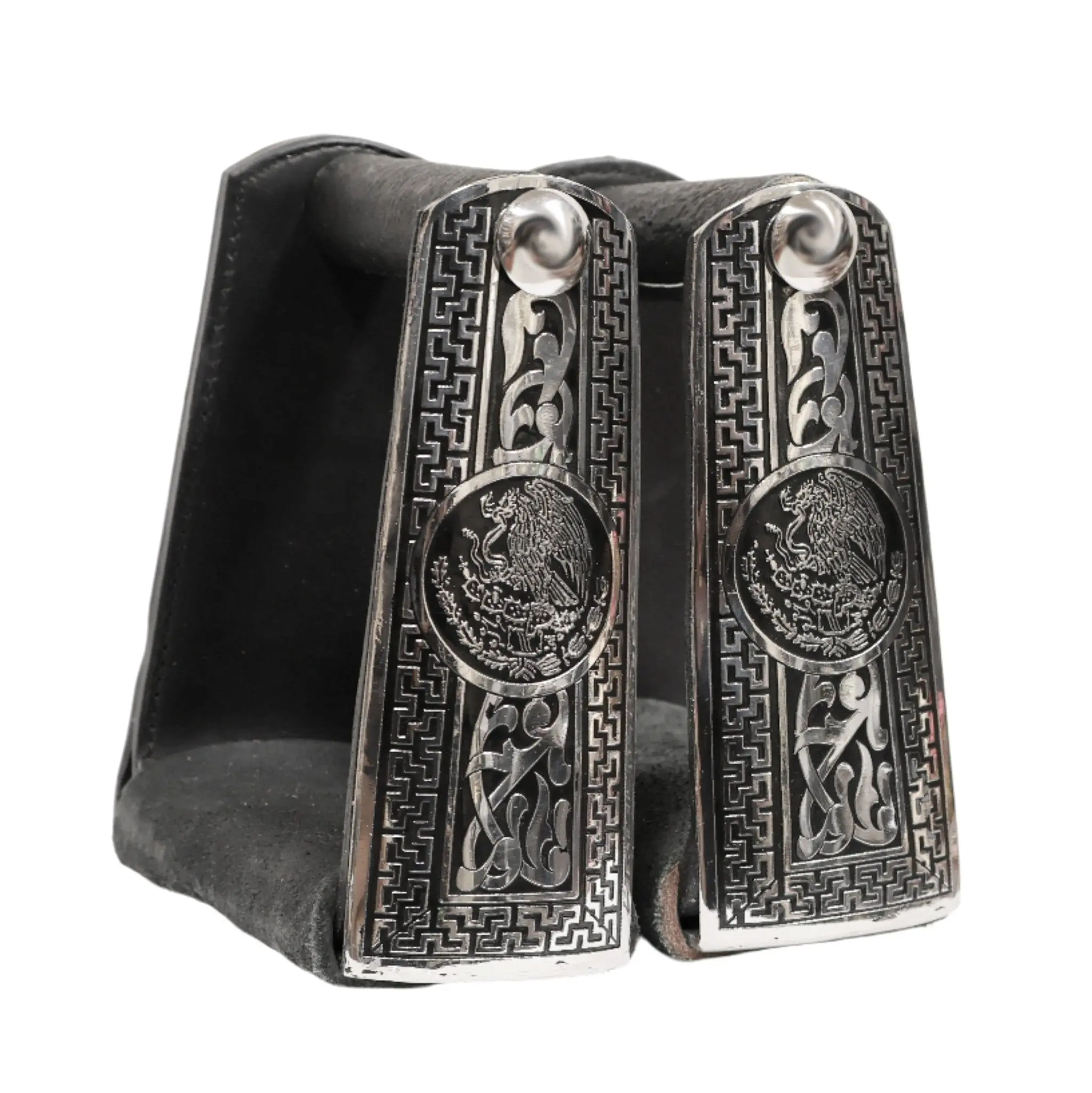 Premium quality stainless steel charro stirrups with suede boot-rest. Estribos charros de primera calidad hechos de acero inoxidable con gamuza en la planta del estribo. Details (detalles) :