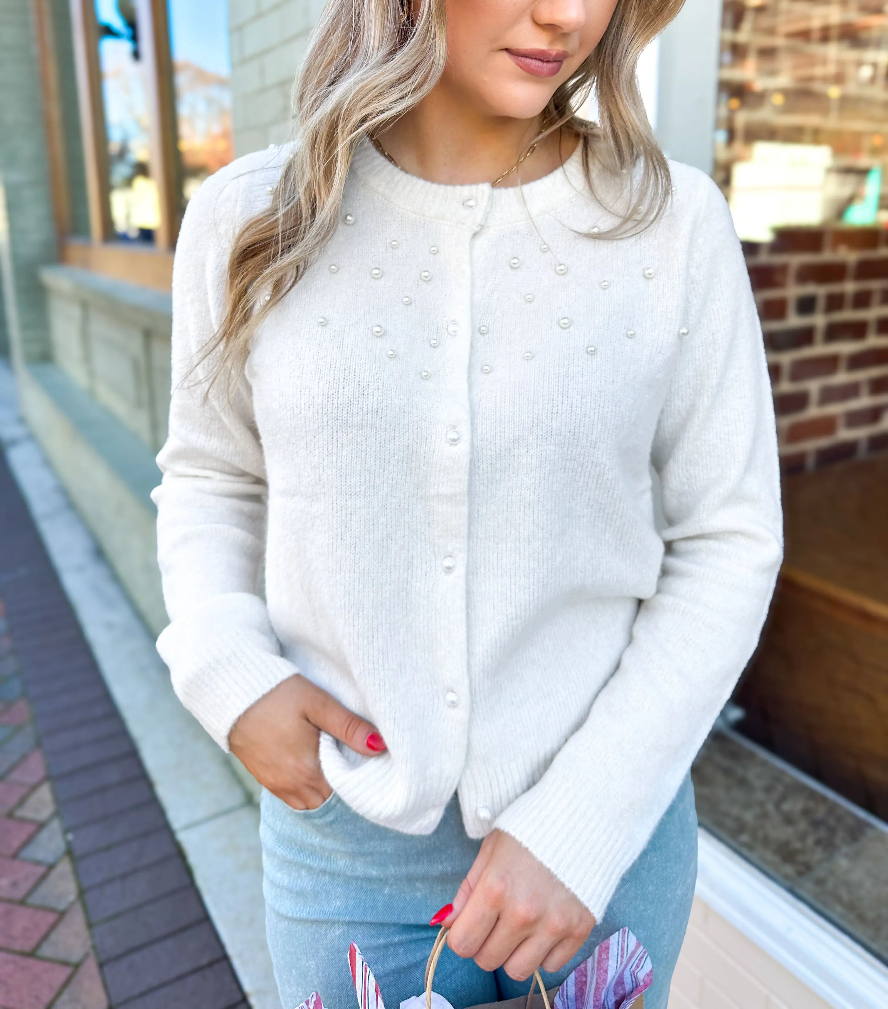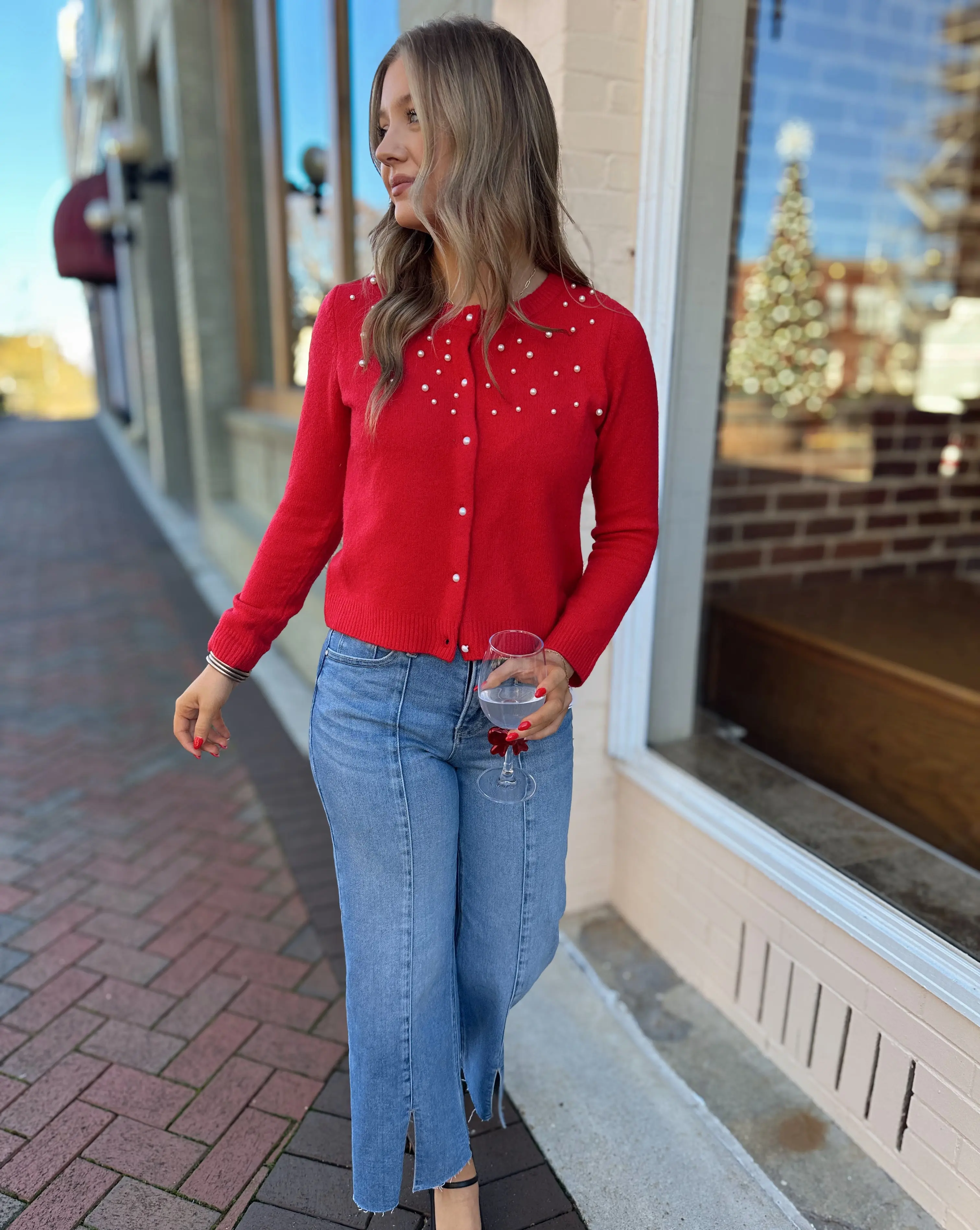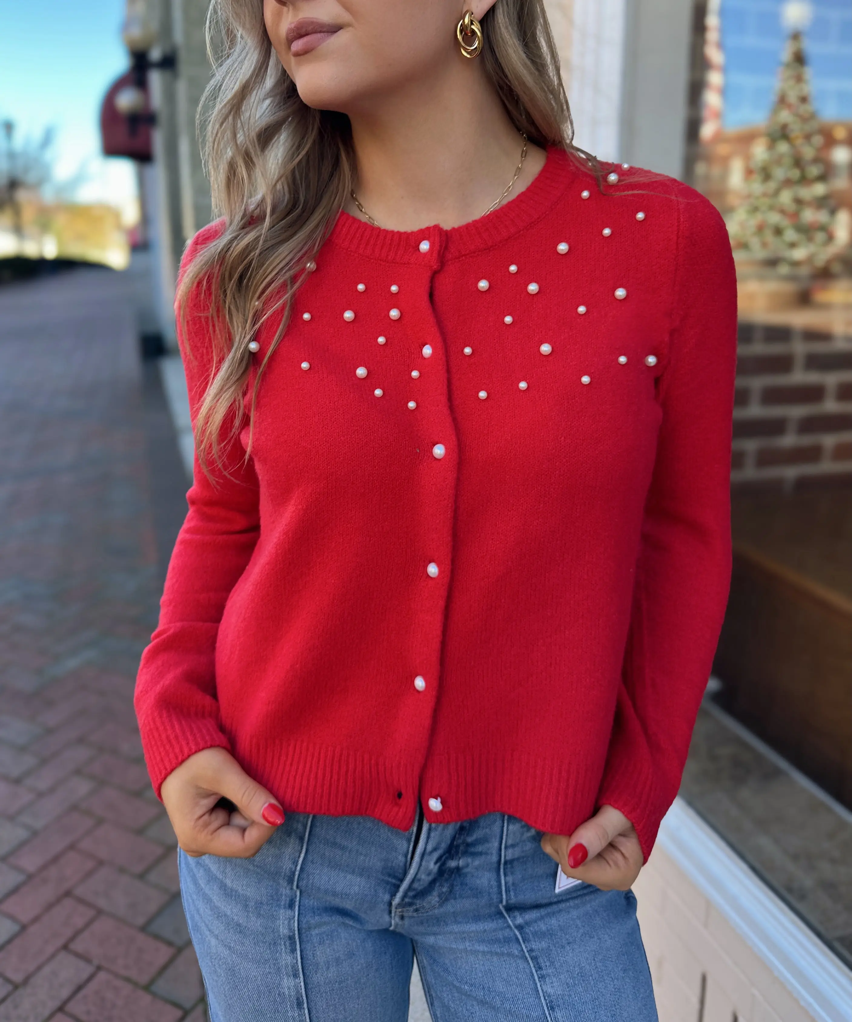 This new cardigan is the perfect blend of timeless and festive! Available in cream and red, this long-sleeve sweater features delicate pearl accents that add a touch of elegance to any look. Dress it up for Christmas gatherings or layer it over your favorite outfit for a cozy, chic touch all season long.